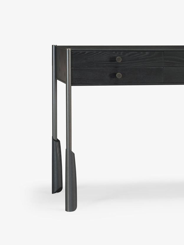 The altai apothecary console table is available in a variety of standard and limited edition veneer and metal finishes. Veneer work is hand-bookmatched. All edges are solid timber to match for added durability. Construction is mortise-and-tenon joinery throughout. 6 drawers–hand-fitted on traditional wood runners–in timber to match are standard.  Skram no. 114 machined knobs are standard (matched to metal finish). Custom sizes, configurations, and materials are available. This product is suitable for residential or contract use.