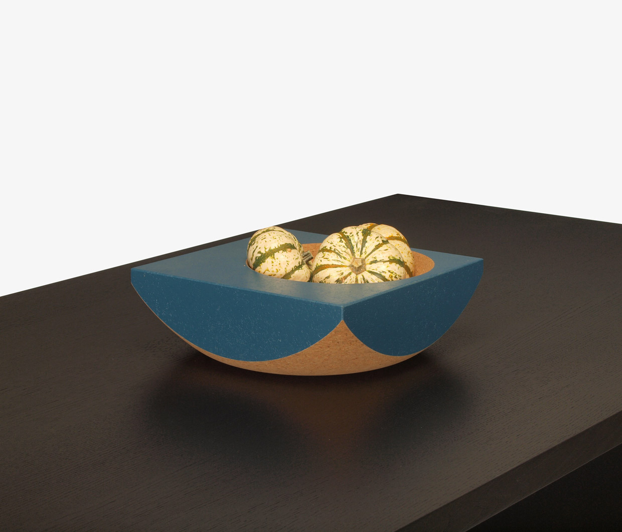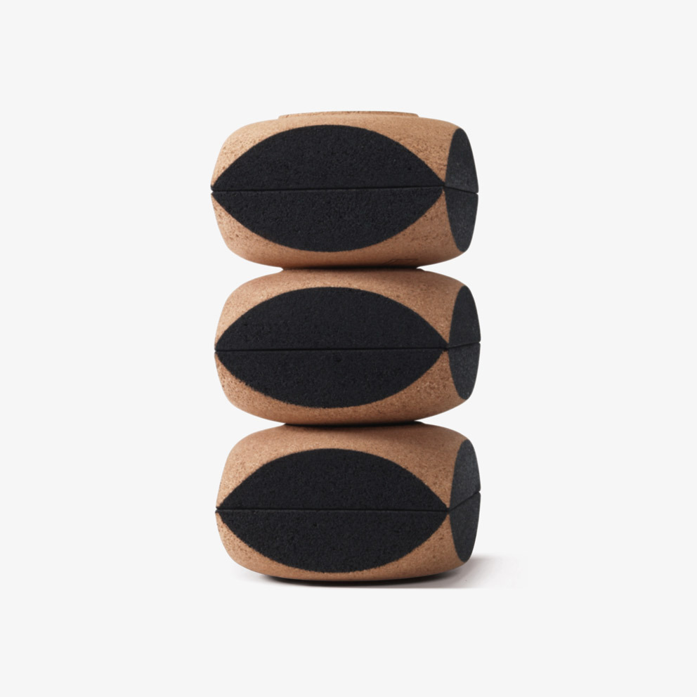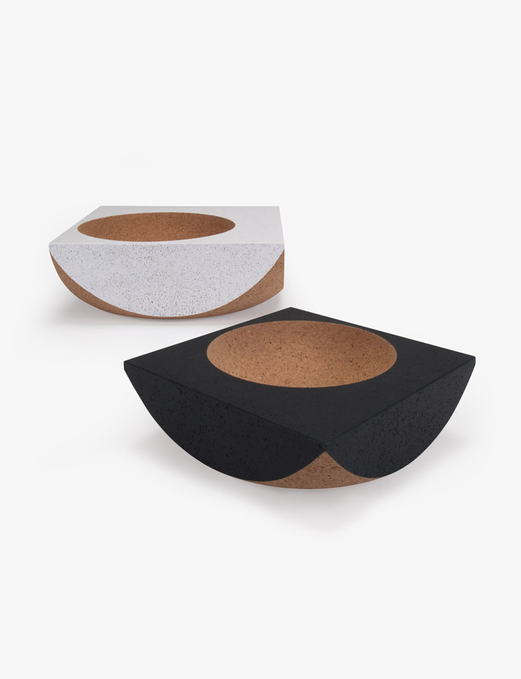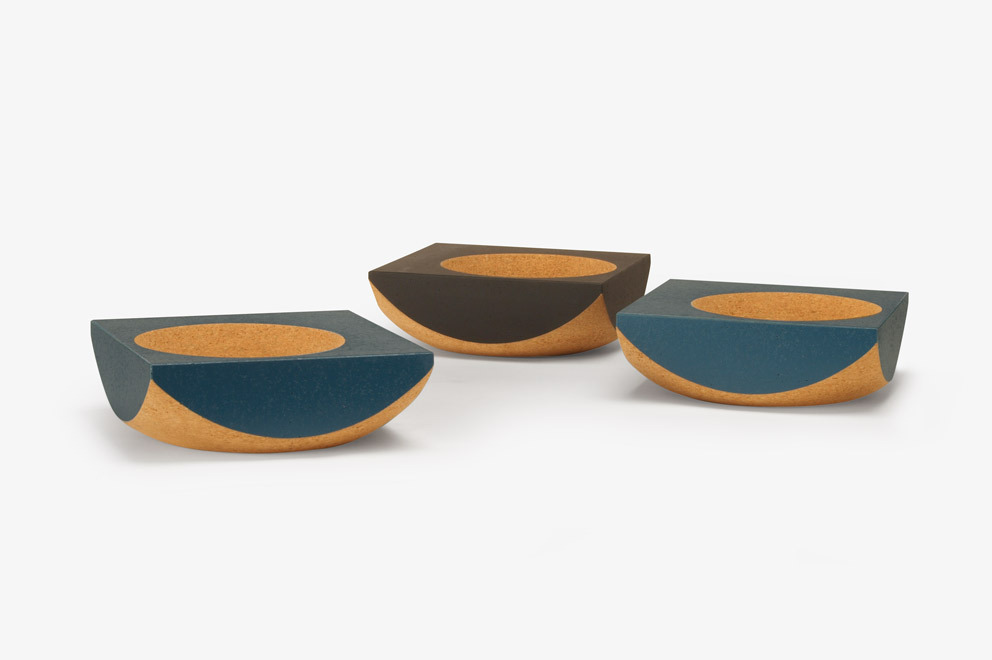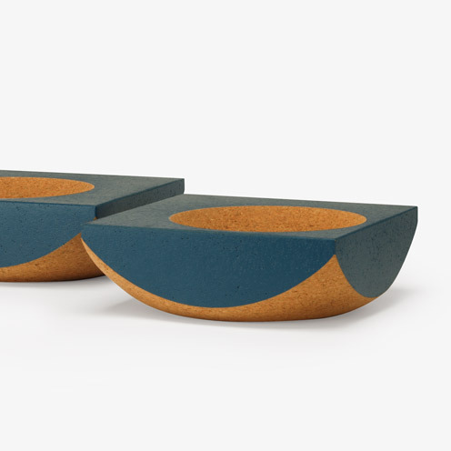 Corkbowl no. 1 is a decorative vessel made of high density cork. It features an offset half-sphere lathe-turned into the face and an undercut edge. Clients may specify opaque matte accent color or all-natural cork. This product may be subject to wholesale minimums.