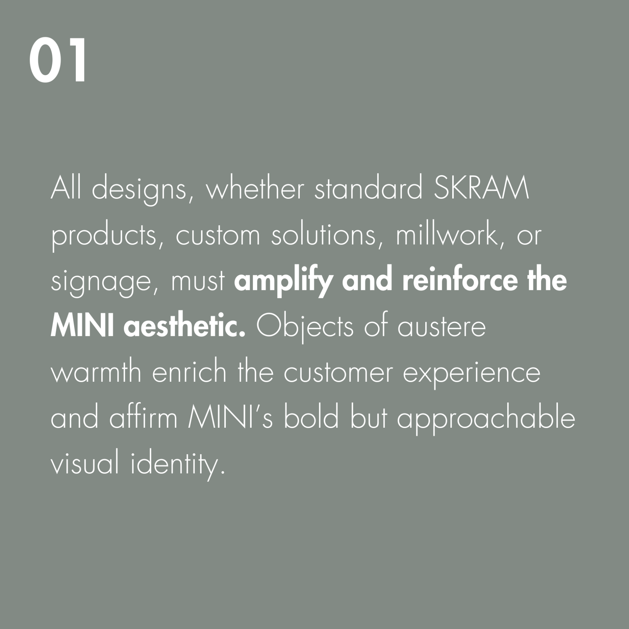 Automobile brand MINI USA approached SKRAM seeking alternatives to existing specifications to refine and realize a more compelling interpretation of the MINI client experience. The pilot project would be sited at a key Utah dealership with owners who were existing SKRAM clients, already familiar with the Company's background in providing innovative, tailored solutions for design-driven commercial spaces.