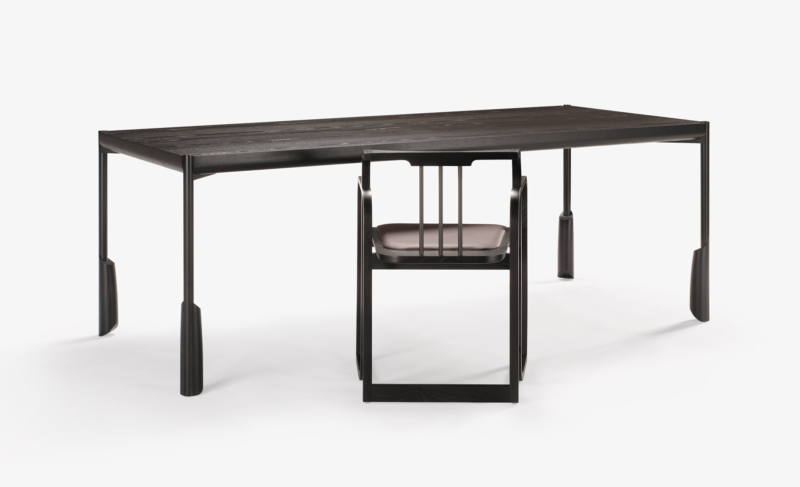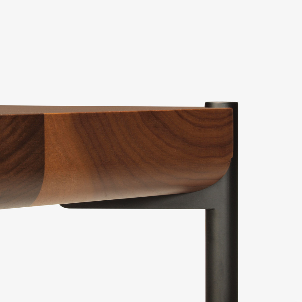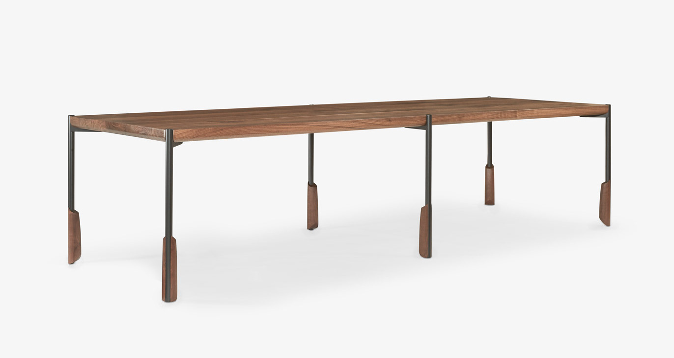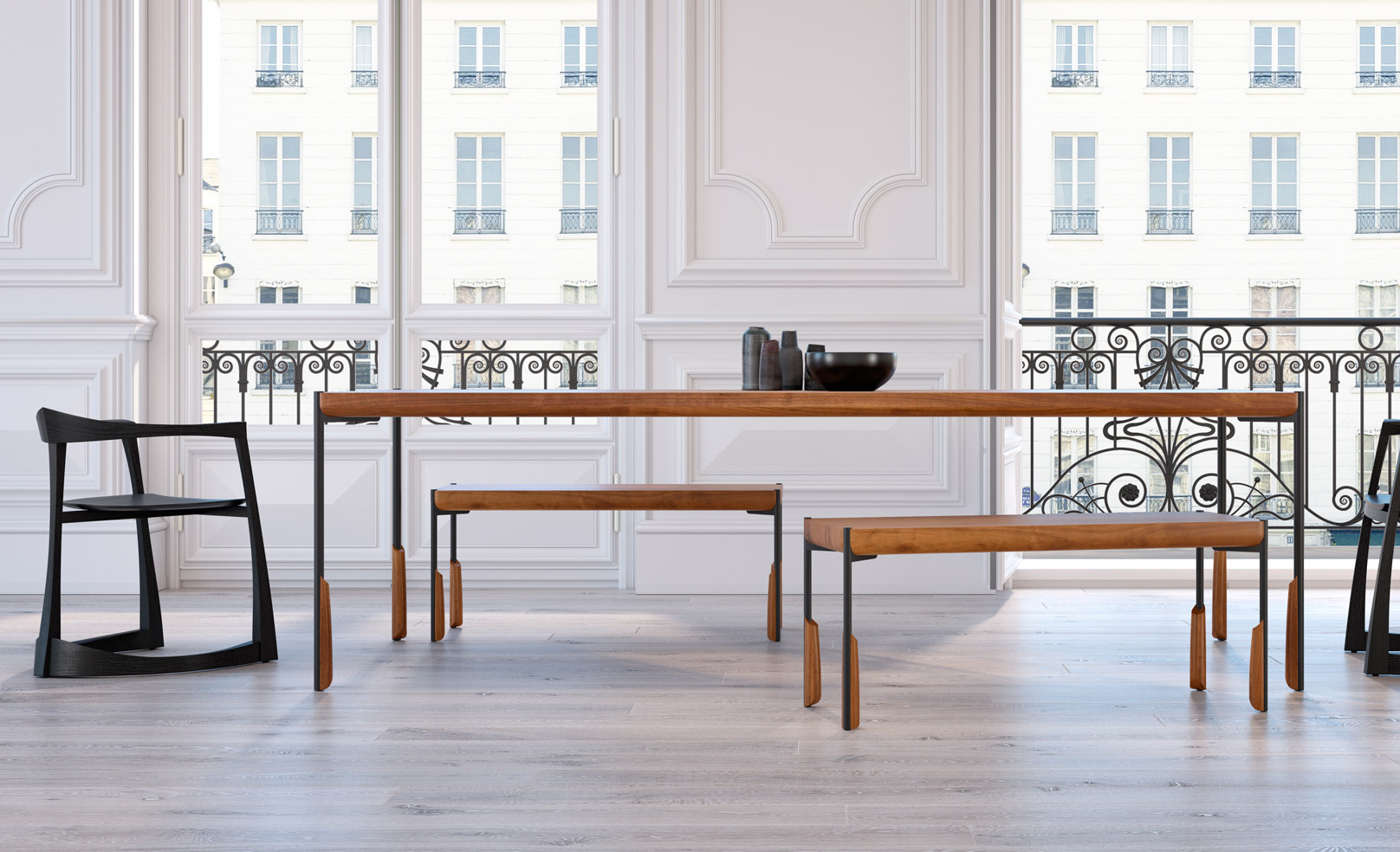 Altai collection dining tables features include a solid 2.5” thick timber top with reverse bullnose edge profile and 6 legs with Altai’s signature design in metal and carved timber. Steel ‘strongbacks’ (recessed into the table underside to control seasonal movement) are standard on this and all large skram tables. Custom size, material, and configuration options are available. Residential or contract use.