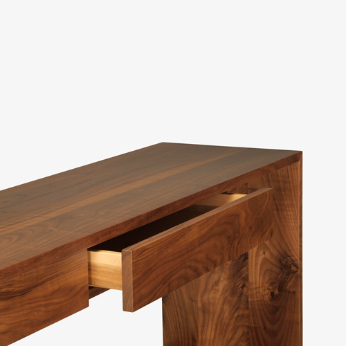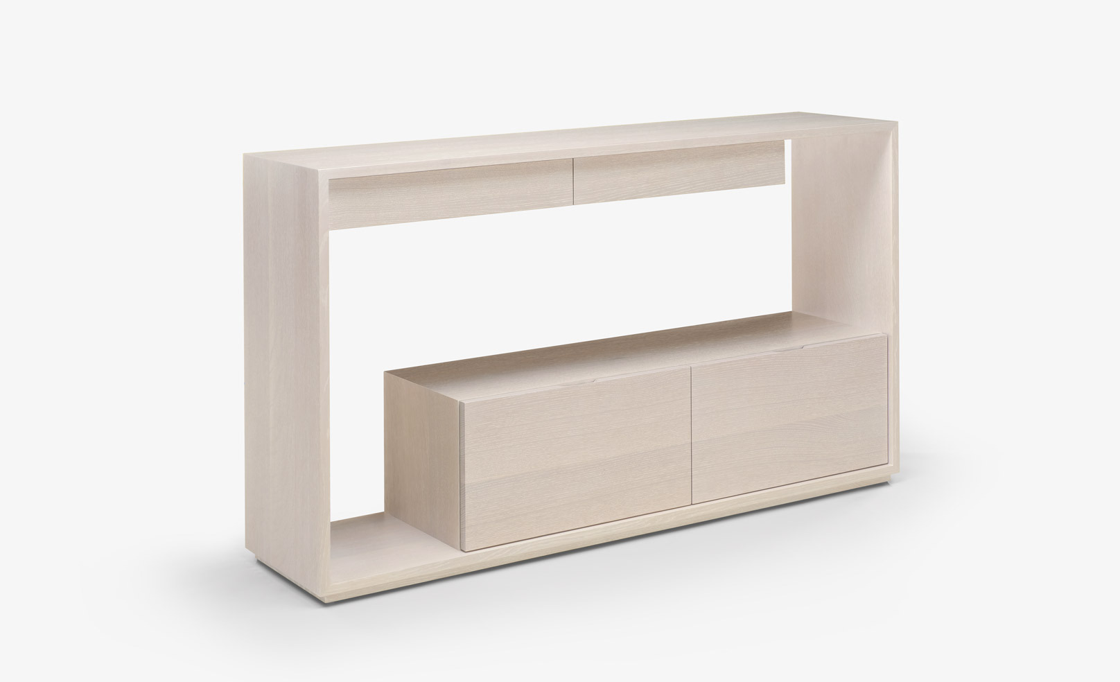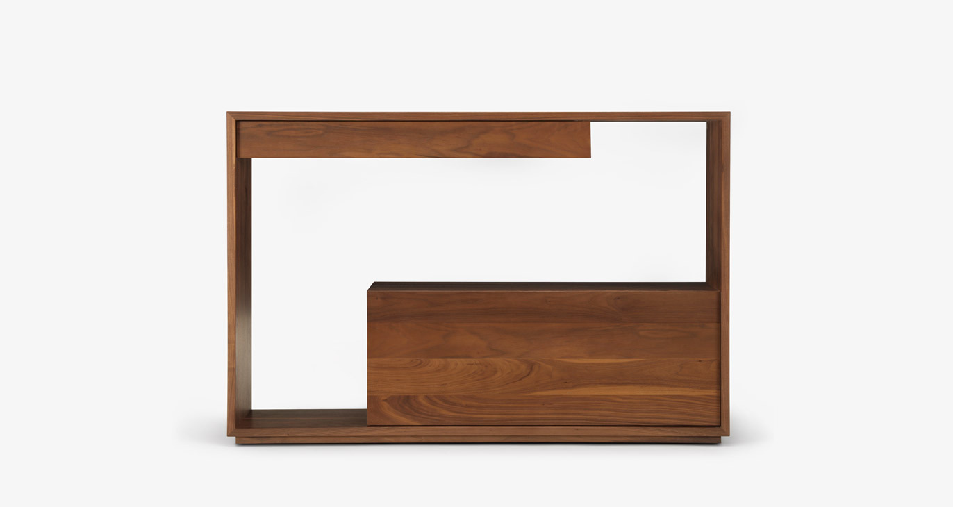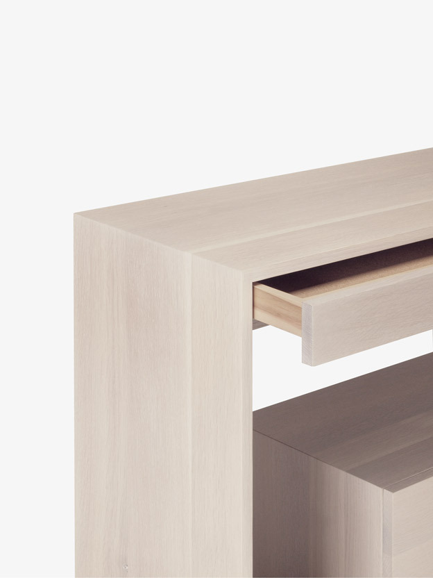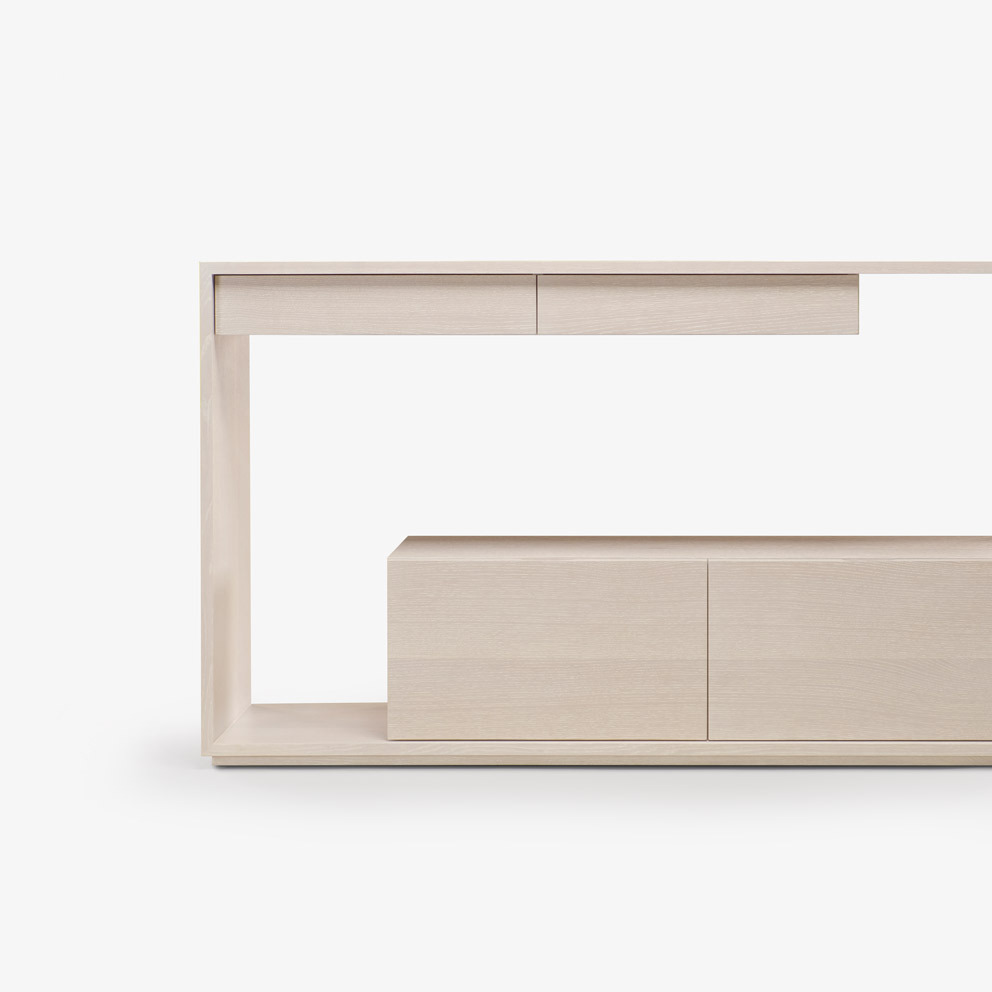 Lineground consoles feature solid timber construction, mortise-and-tenon joinery, and mitered corners with matched seams/waterfall edges. Drawers are maple timber with cork-lined bottoms with soft-closing concealed runners and recessed, integral pulls. Custom sizes, configurations, and materials are available. Residential or contract use.