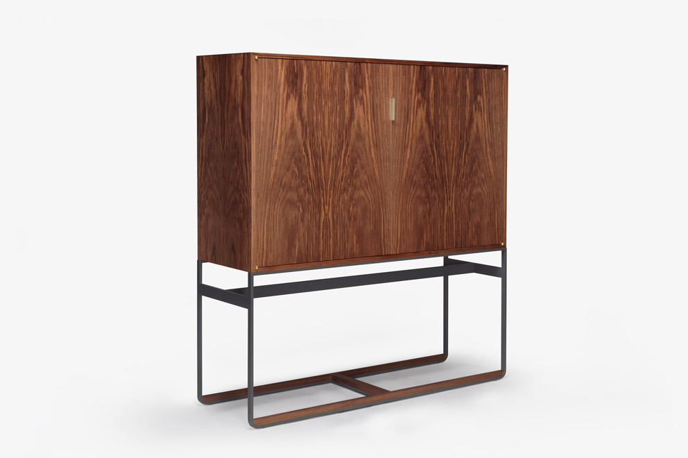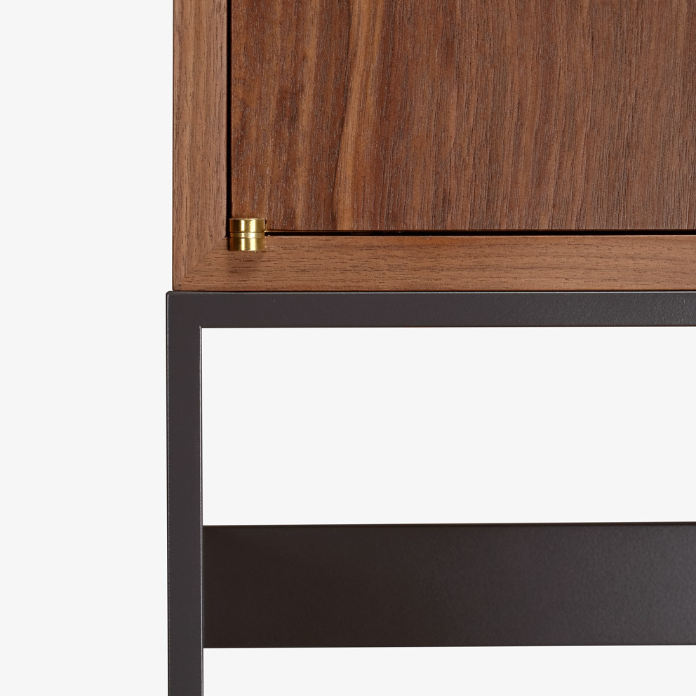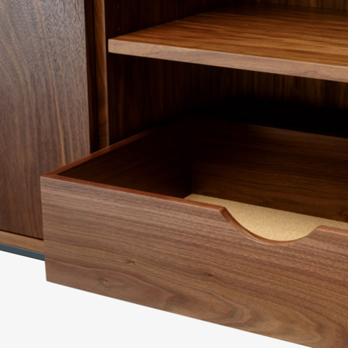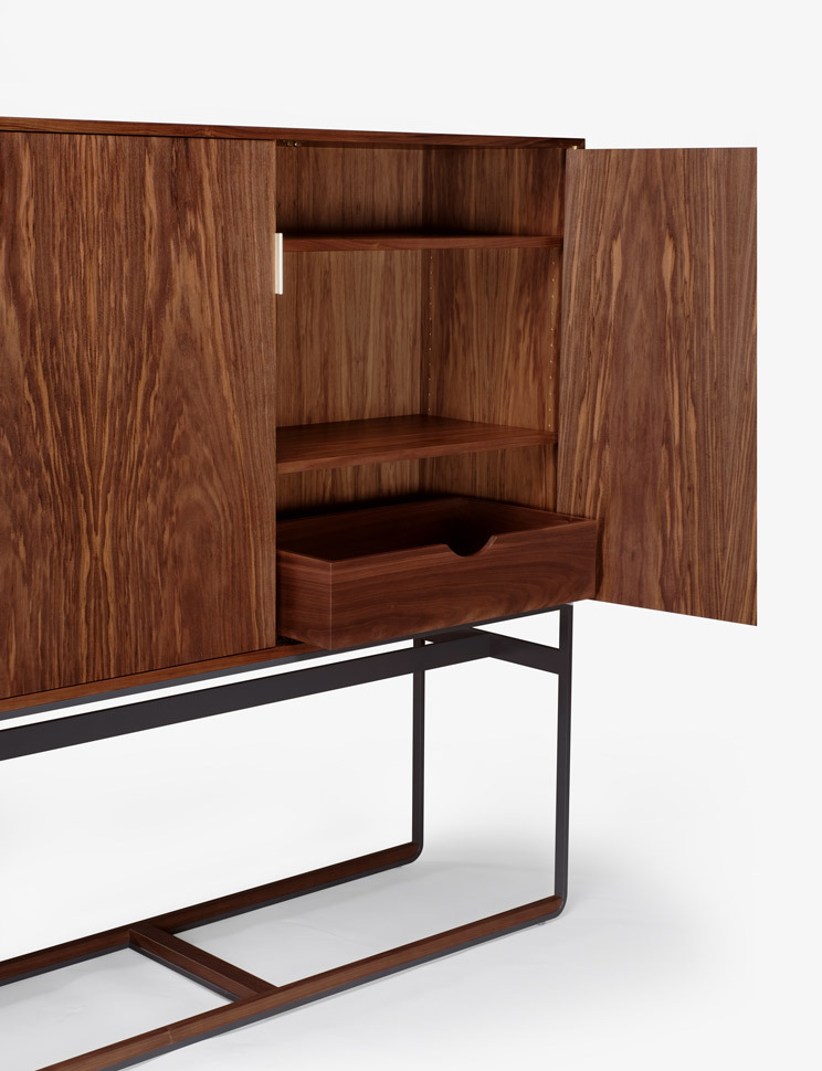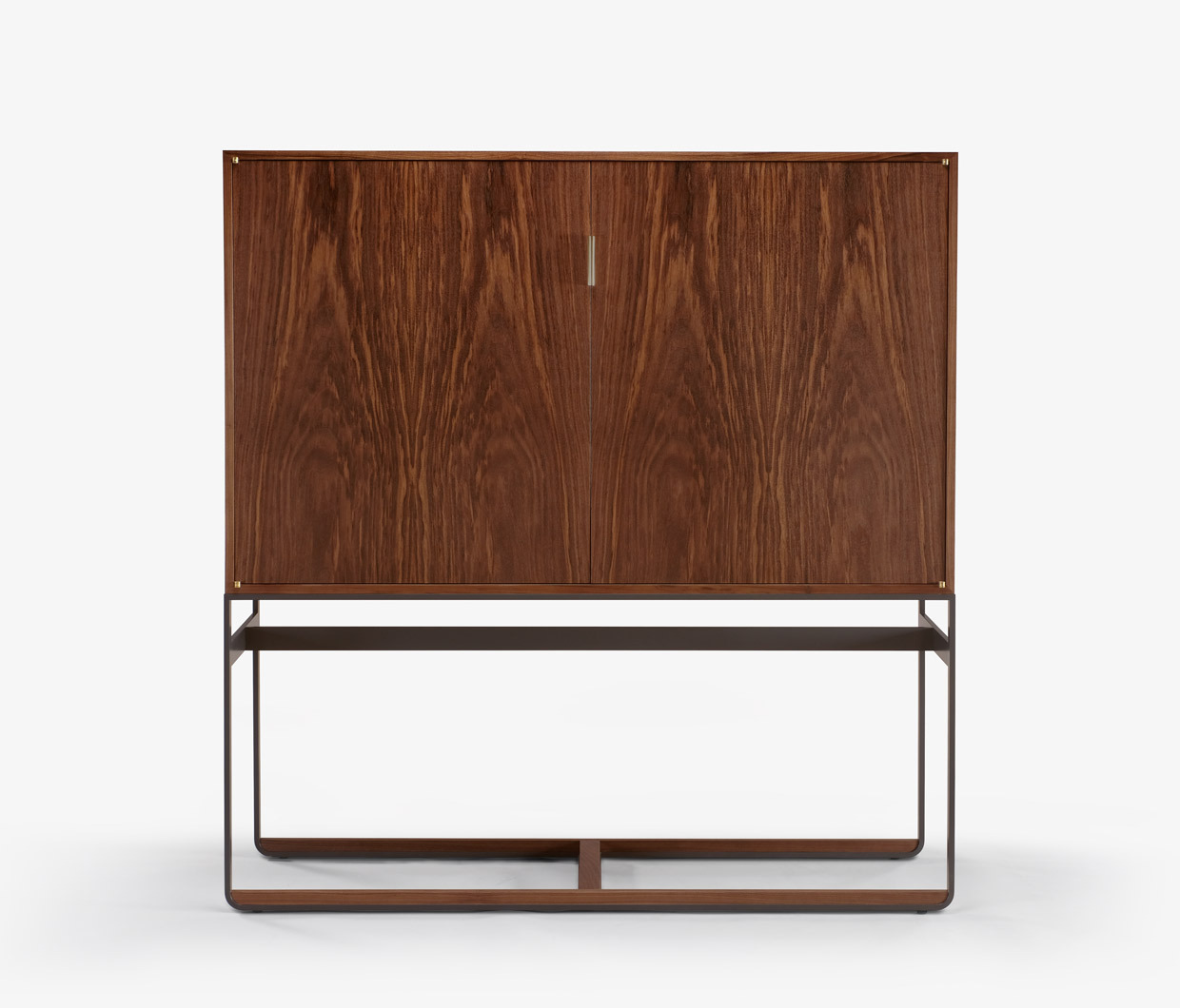 The piedmont cabinet-on-stand is offered in 2 models: Standard (ST) or limited edition (LE). Both feature 2 large doors in hand-matched longwoods (ST) or burls (LE). Construction is mitered with ‘waterfall’ edges and mortise-and-tenon joinery. All edges and corners are reinforced with solid timber for added durability. Doors open via low profile tab pulls in natural rubbed bronze (NRB). Doors operate via precision-machined offset knife hinges in bronze (NRB). 2 adjustable shelves/1 pull-out drawer per cabinet area. Contact skram for customization and limited edition options. Residential or contract use.