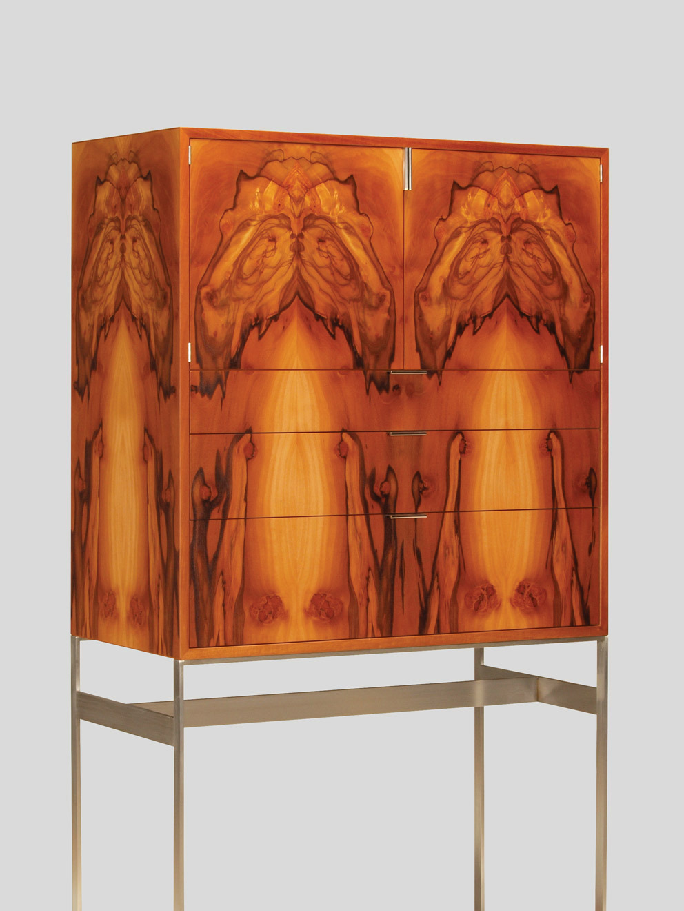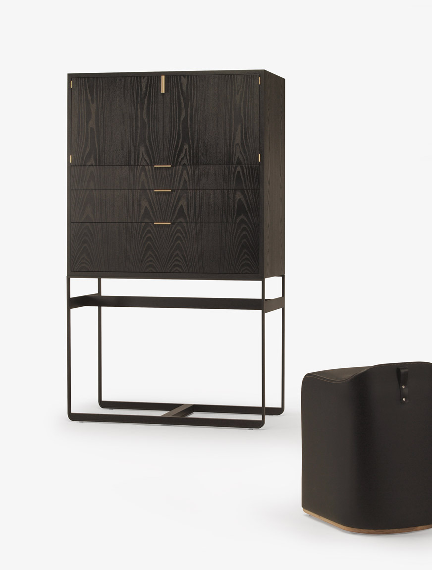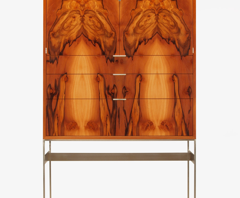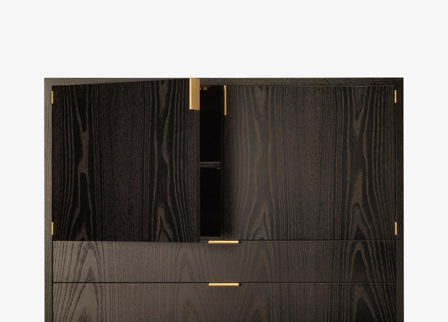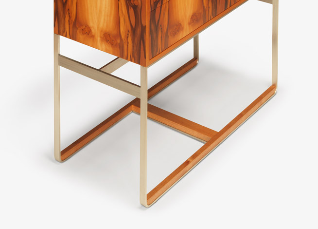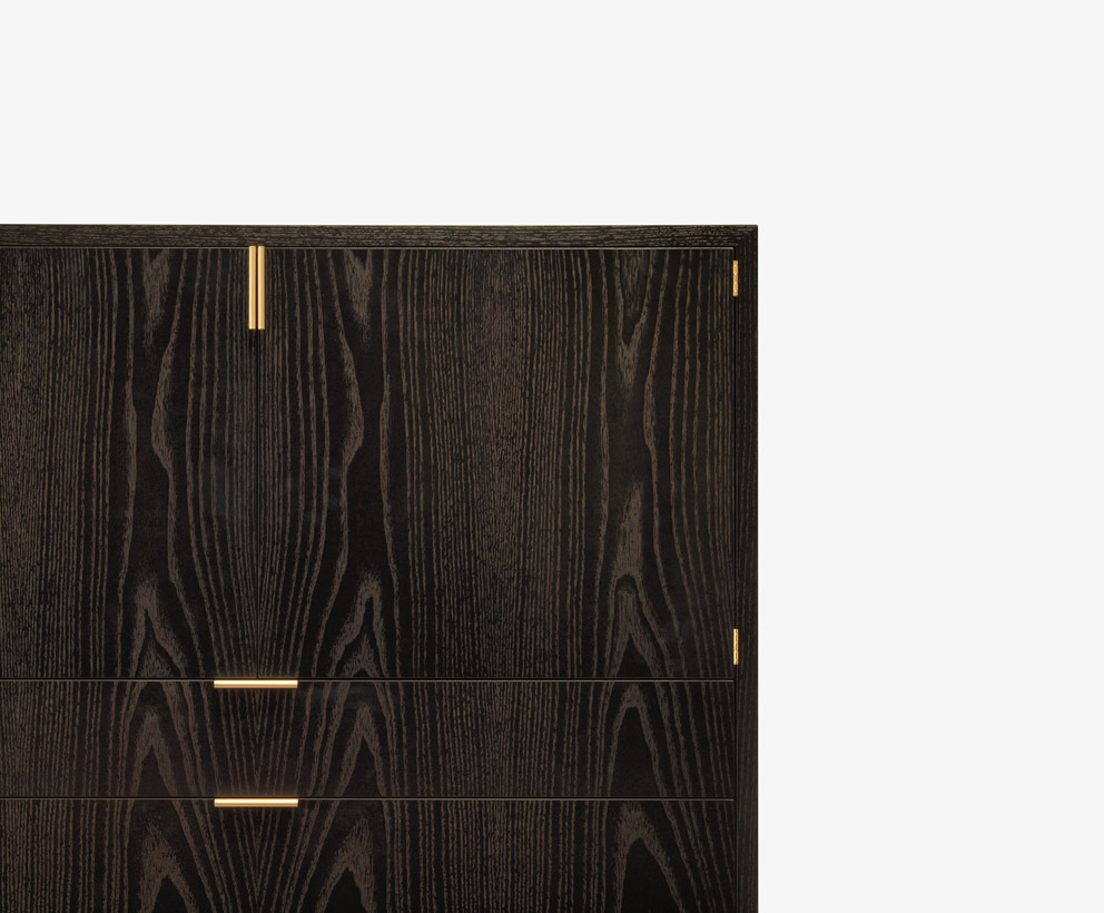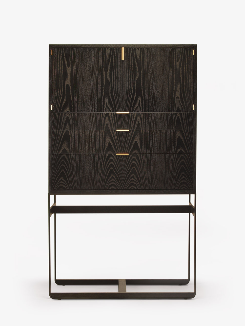 The piedmont chest-on-stand is offered in 2 variants: Standard (ST) or limited edition (LE). Both feature 3 drawers + 2 doors in hand-matched longwoods (ST) or burls (LE). Construction is mitered with ‘waterfall’ edges and mortise-and-tenon joinery. All edges and corners are reinforced with solid timber for added durability. Drawers are solid timber with cork (ST) or burl-lined (LE) drawer bottoms riding on concealed runners. Doors & drawers open via low profile tab pulls in natural rubbed bronze (NRB). Doors operate via precision-machined butt hinges in bronze (NRB). 1 adjustable shelf per cabinet area. Contact skram for customization and limited edition options. Residential or contract use.