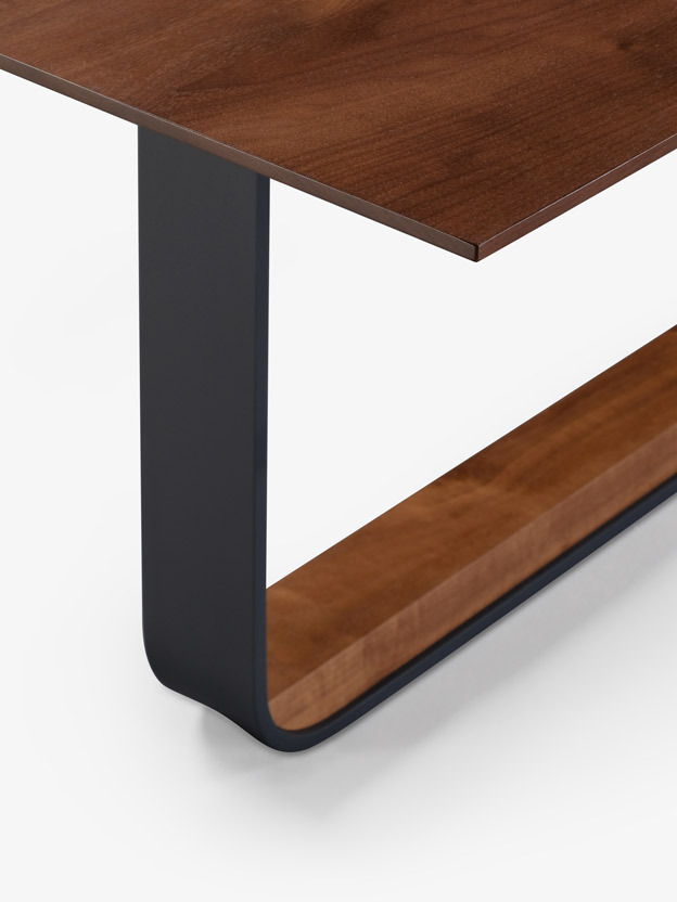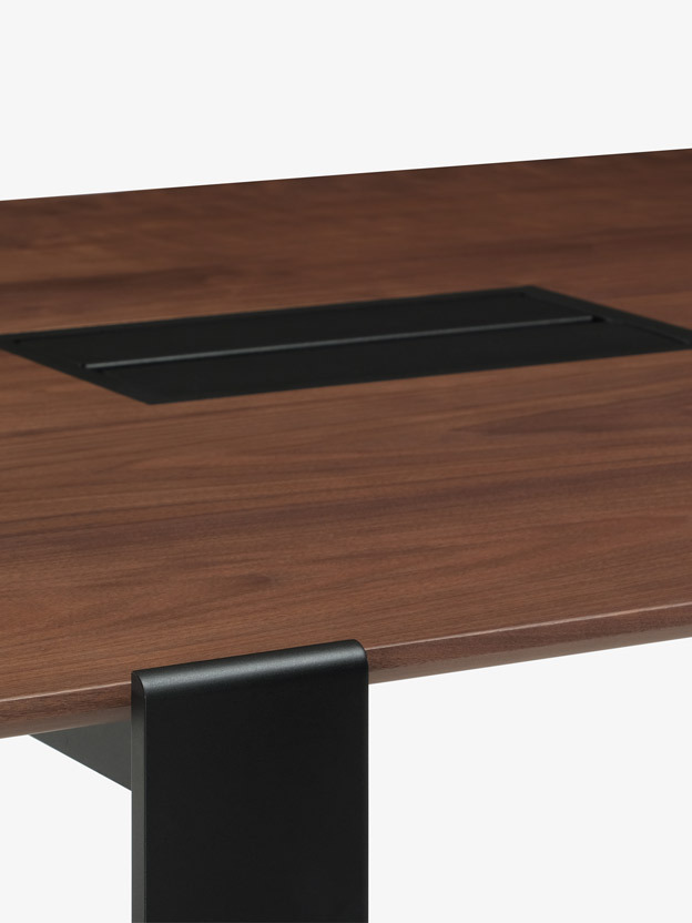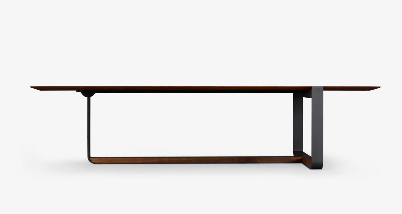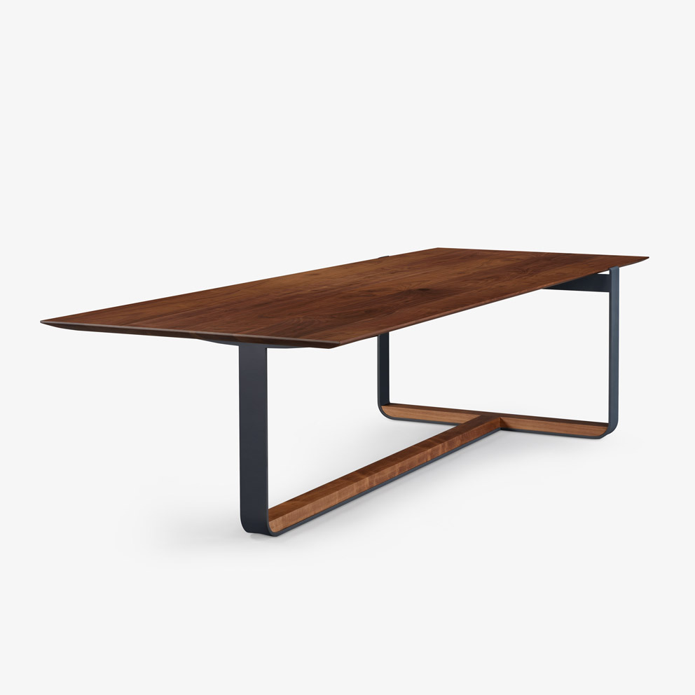 The original piedmont conference/dining table features a rectangular solid timber top. Edge profiles may be flat, reverse bullnose, or wafer undercut (pricing may vary). Spacious accommodation of 10+ persons at standard size. Base is formed steel or bronze with timber detailing to match and adjustable leveler feet. All standard timber and metal finishes available. Contact skram for customization options. Residential use. For meeting and boardroom versions at a large scale and/or fully integrated connectivity and wire management options, please refer to contract version of this product for ordering details.