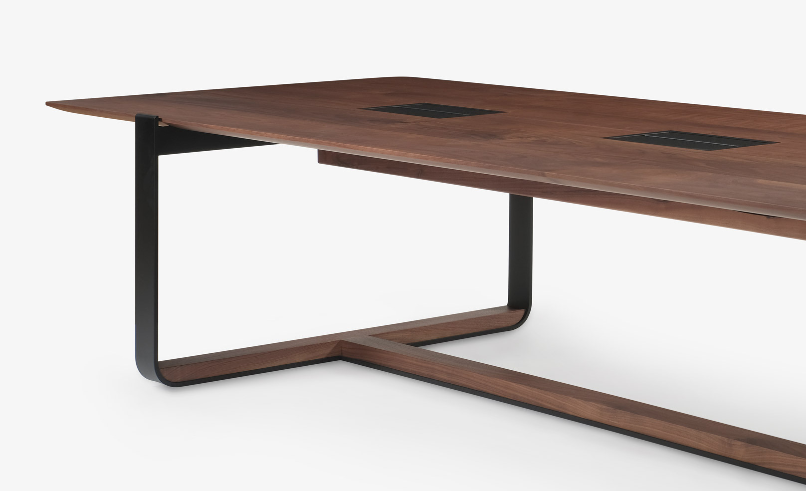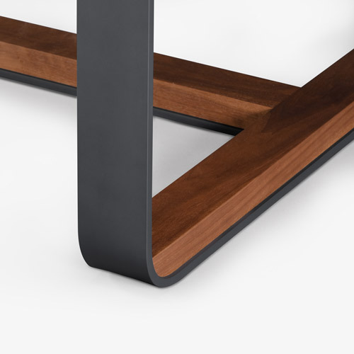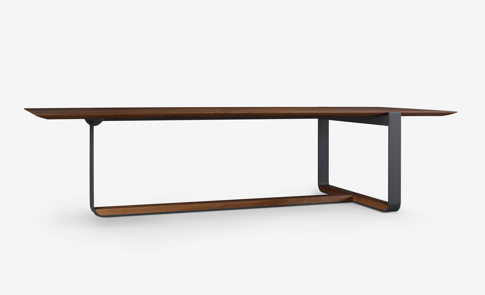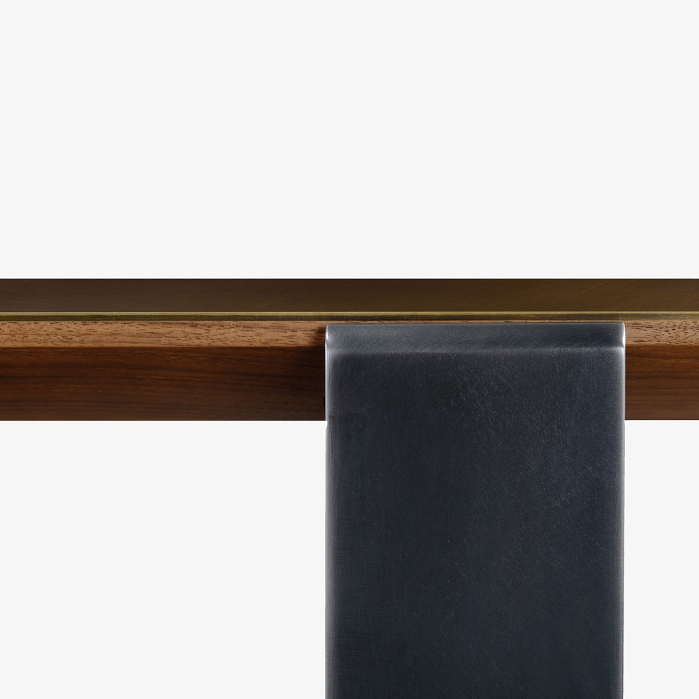 The original piedmont conference/dining table features a rectangular solid timber top. Edge profiles may be flat, reverse bullnose, or wafer undercut (pricing may vary). Spacious accommodation of 10+ persons at standard size. Base is formed steel or bronze with timber detailing to match and adjustable leveler feet. All standard timber and metal finishes available. Contact skram for customization options. Residential use. For meeting and boardroom versions at a large scale and/or fully integrated connectivity and wire management options, please refer to contract version of this product for ordering details.