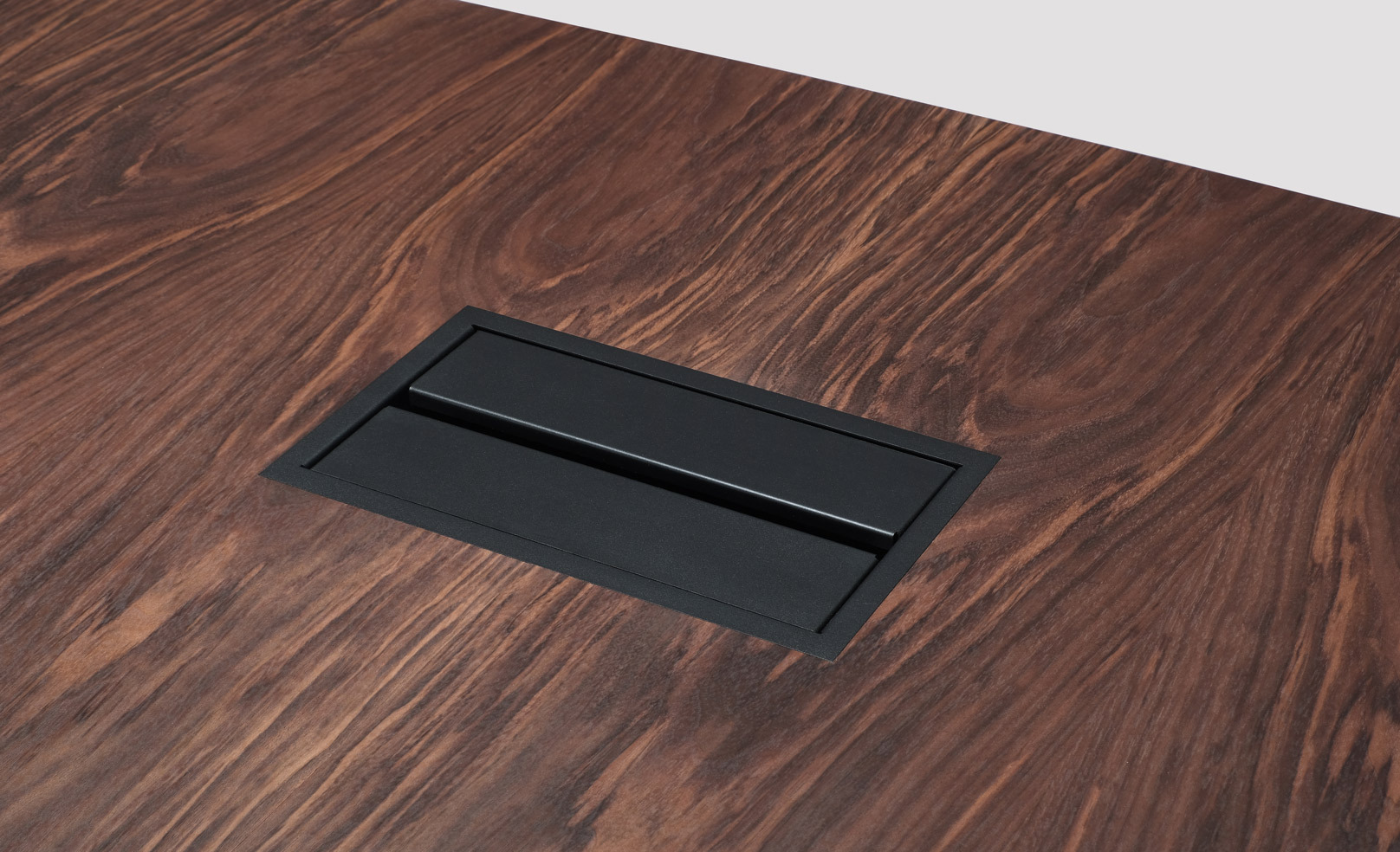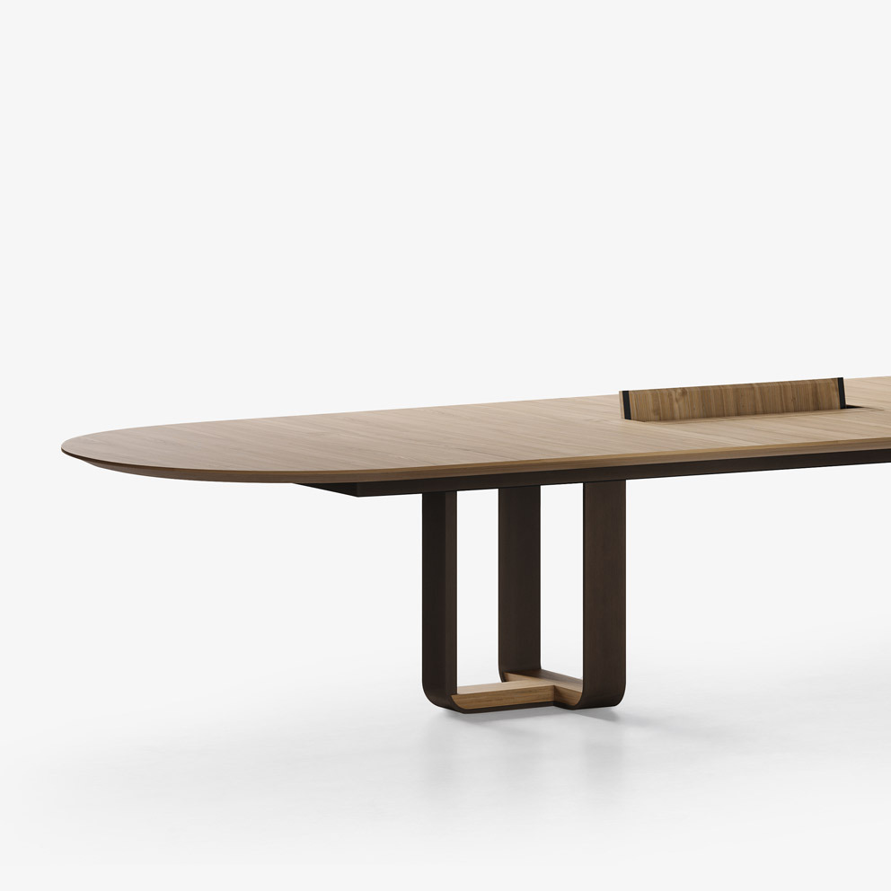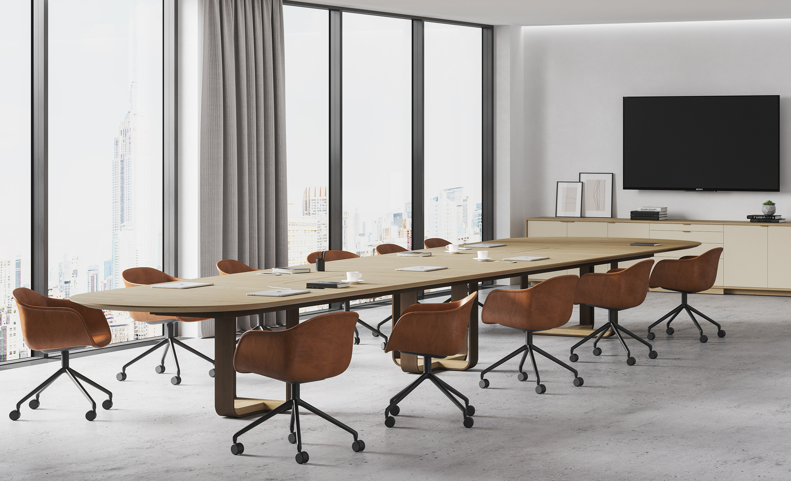 Developed to meet demands for our piedmont pedestal table in commercial/contract settings, skram offers the P33 meeting tables. Made-to-order to client specifications, the P33 meeting table is available in widths from 84-288” and depths from 36-72”. There are two basic top shapes: Boat or taper. Tops are constructed of mixed timber solids and hand-bookmatched longwood veneers. Fully integrated connectivity options and fully concealed wire management from table surface to floor may be tailored to specific needs. Limited edition and custom materials, sizes, and configurations also available. Contract use.