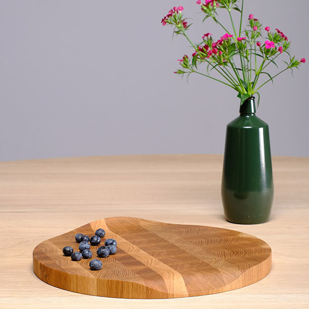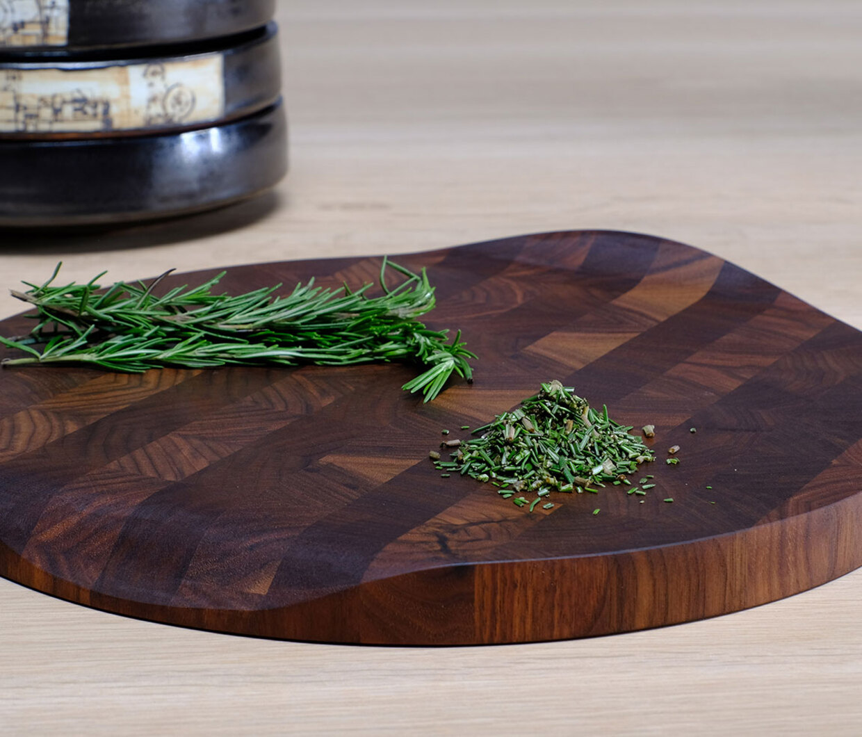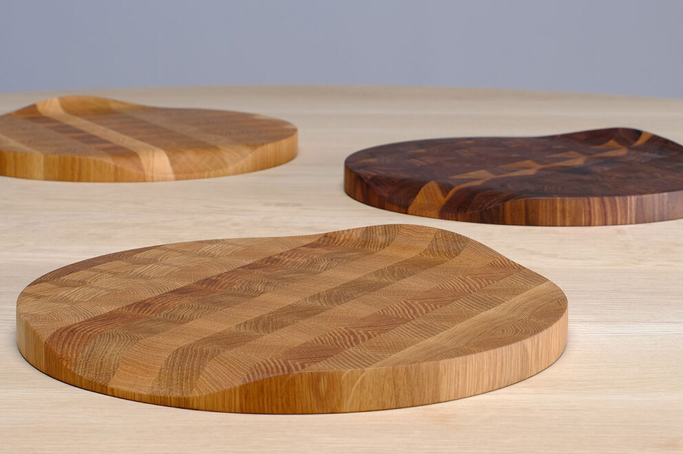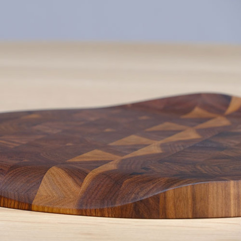 Serving board is an end-grain (butcher block) serving accessory developed by skram to utilize offcuts from the manufacture of large tables and casegoods. The product is intended for commercial or residential use. It is offered in a standard 14” diameter with a carved, integral handle and slope. Custom contract production of variants of this item is possible for hospitality contexts. This product may be subject to wholesale minimums.