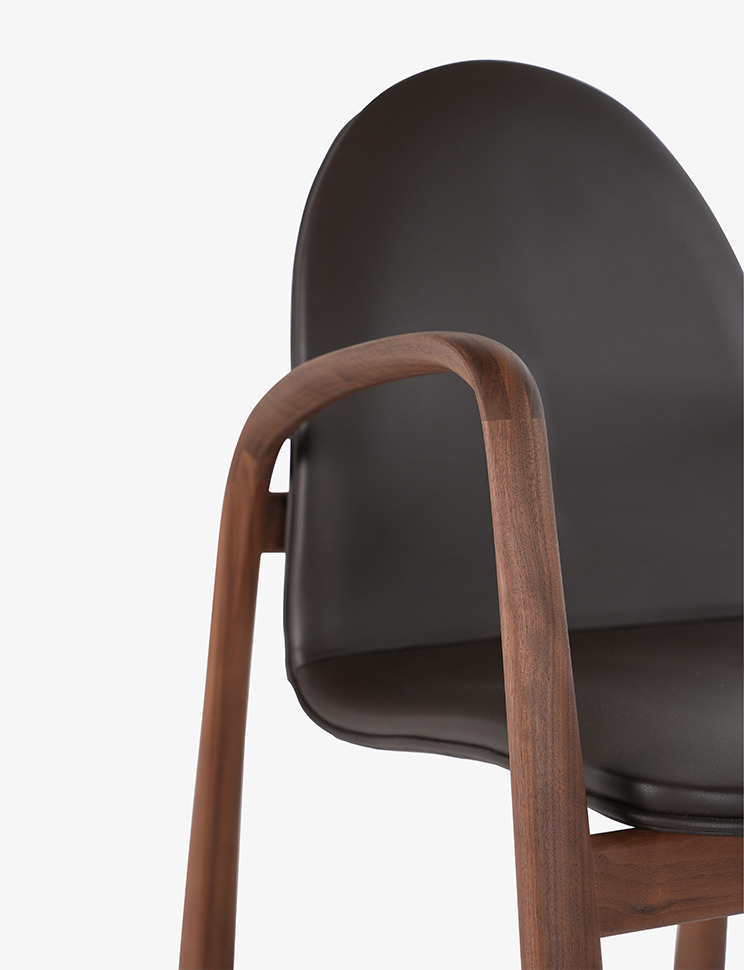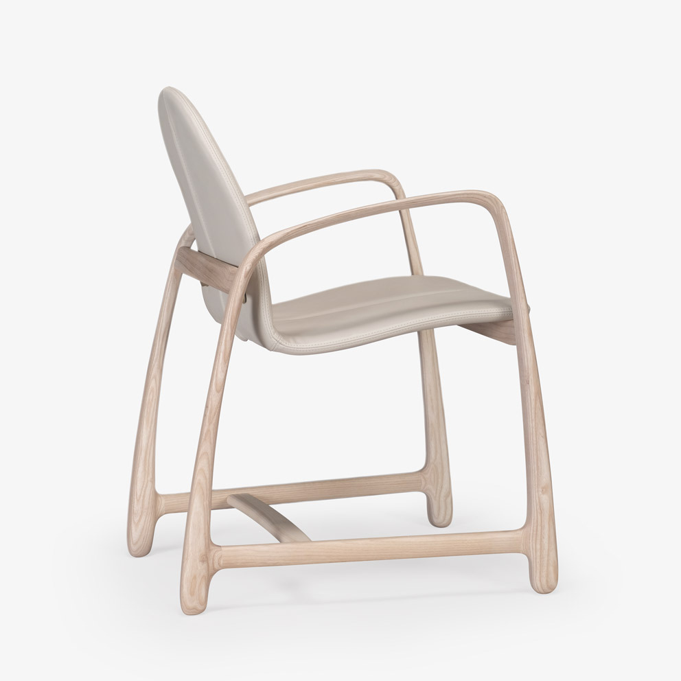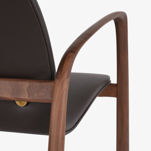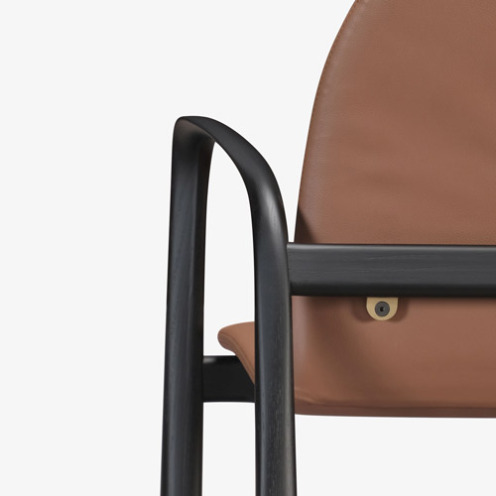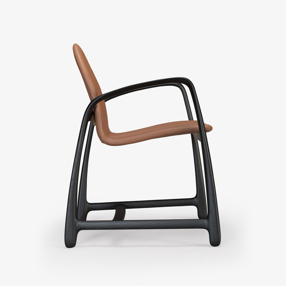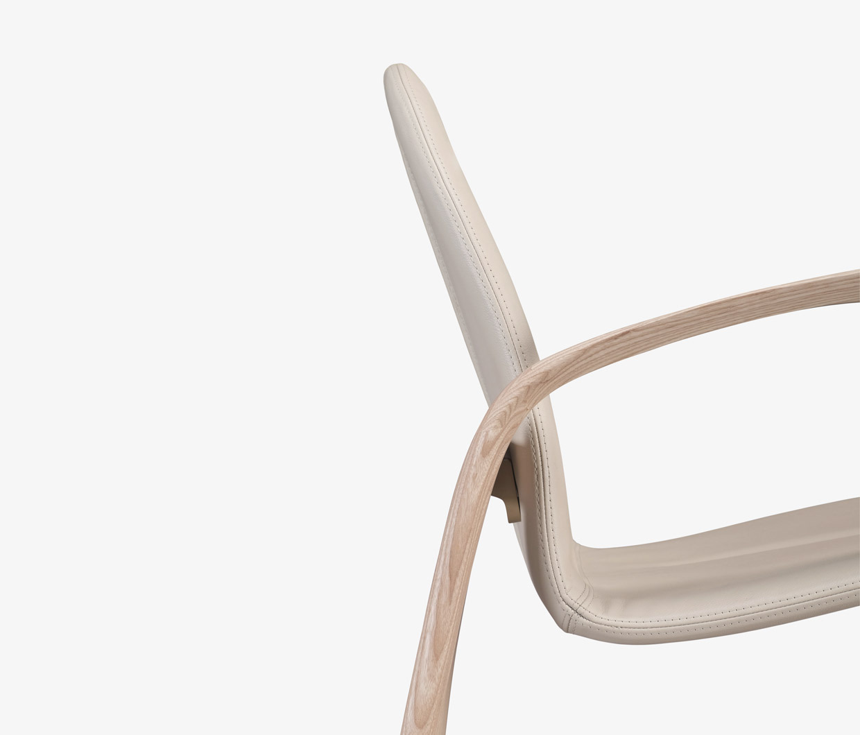 The V4 Armchair features a three-dimensional seat–upholstered in leather or COM fabrics–that mates effortlessly with a sinuous solid timber frame available in natural Walnut or various Ash finishes.