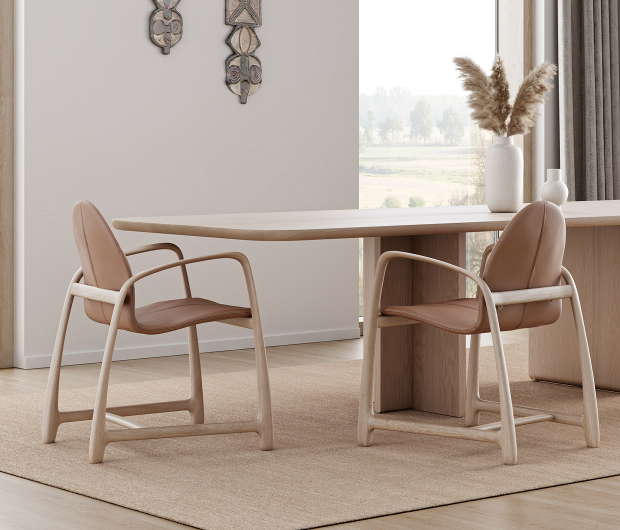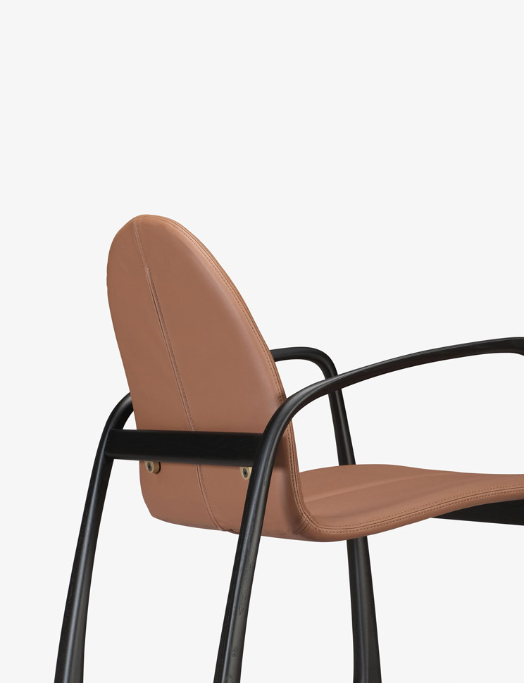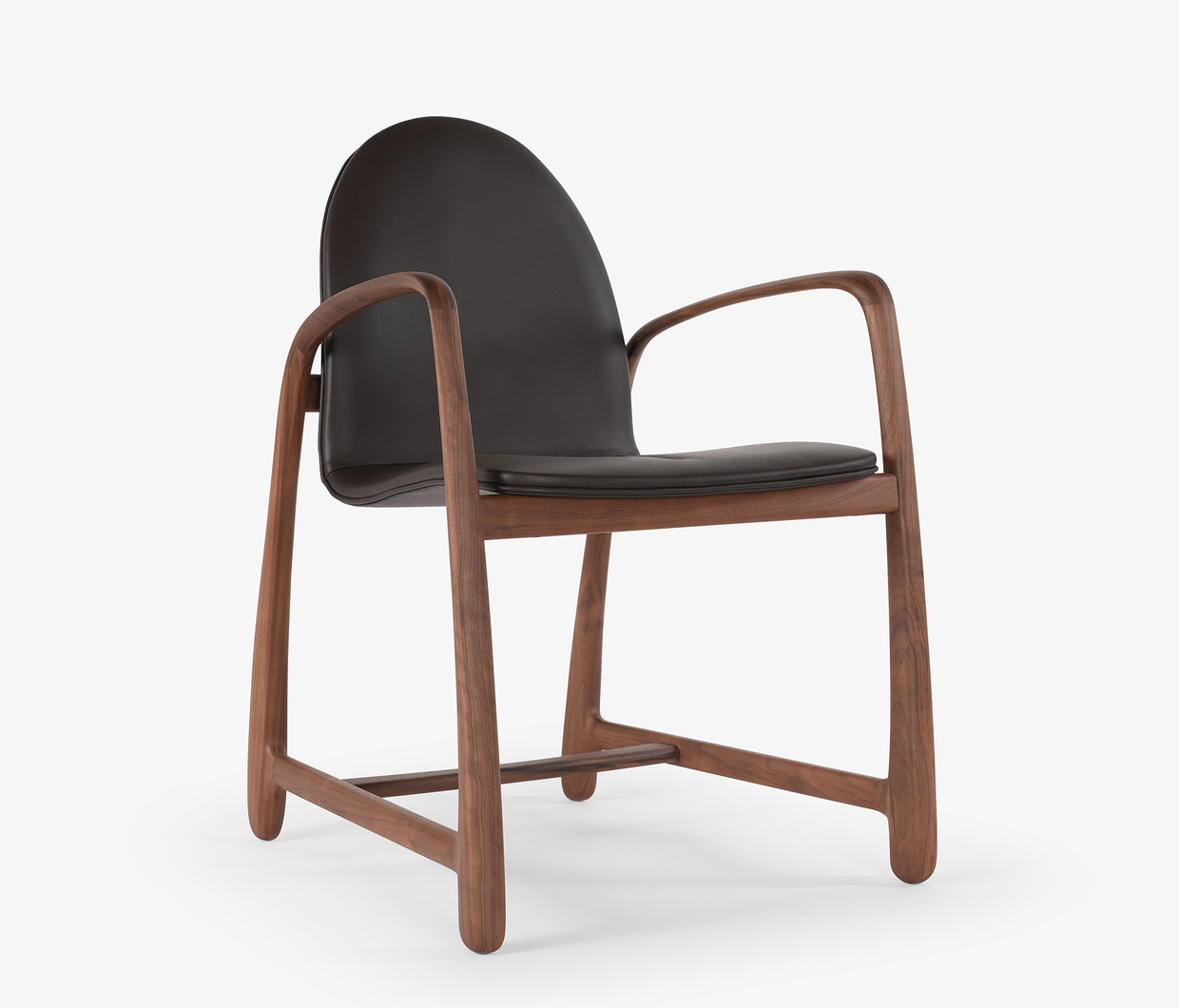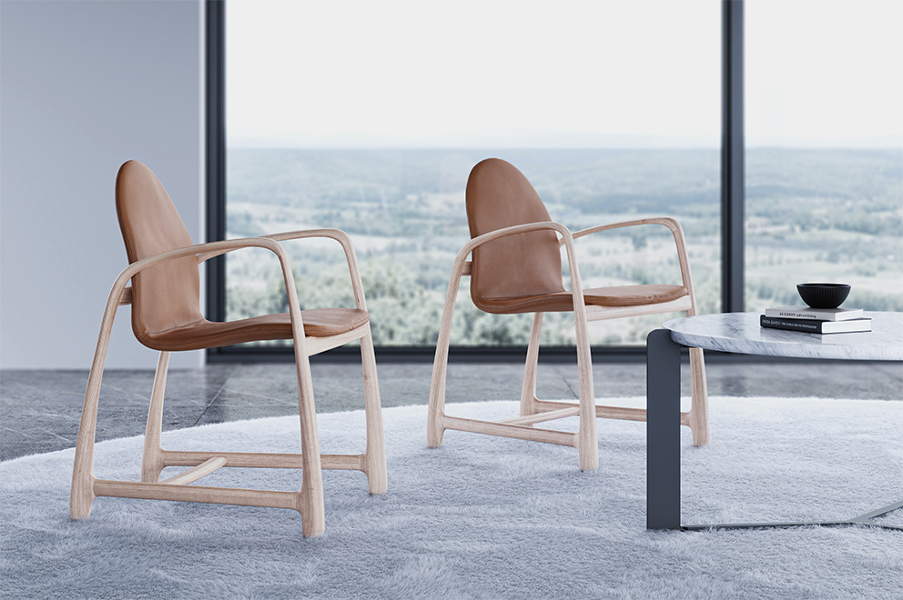 The V4 Armchair features a three-dimensional seat–upholstered in leather or COM fabrics–that mates effortlessly with a sinuous solid timber frame available in natural Walnut or various Ash finishes.
