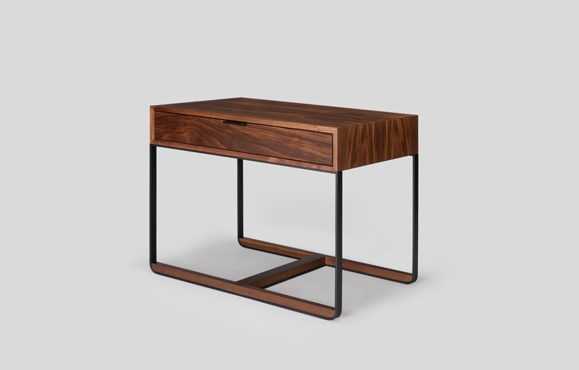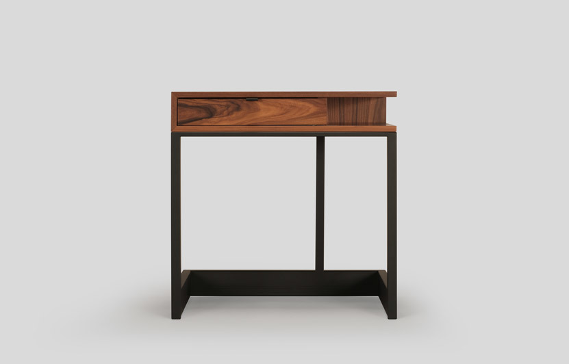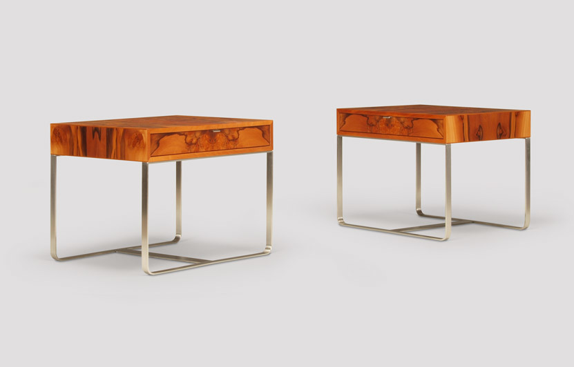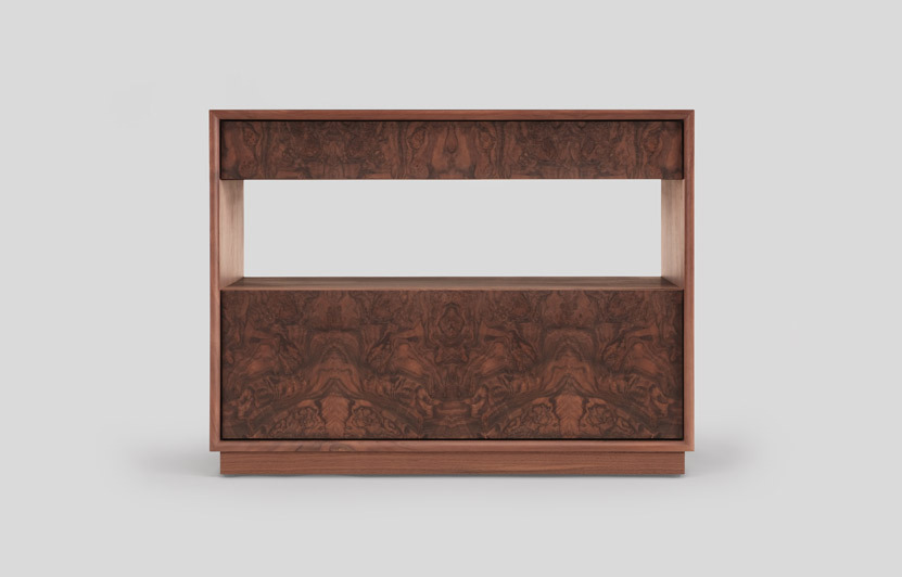 Hand-bookmatched veneer longwoods with solid timber banding/inlay on all edges and corners for added protection. Commercial-grade, low sheen natural wood finish. Green guard certified. Solid maple, cork-lined drawer riding on concealed runners. As shown here in figured walnut with matte opaque black metalwork and hardware. Contact skram for more details.