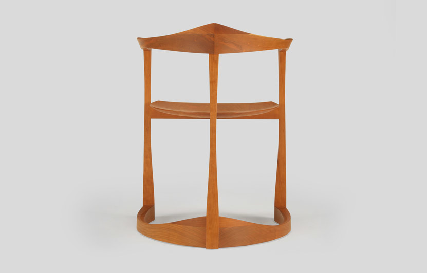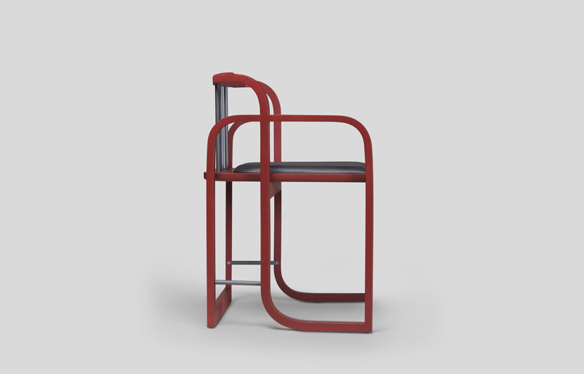 Steam-bent timber frame in opaque red with mortise-and-tenon, pinned half-lap, and triple spline joinery. Low profile, high density upholstered drop-in seat in mammut_pewter leather. Back splats and stretchers in matte blasted steel finish.