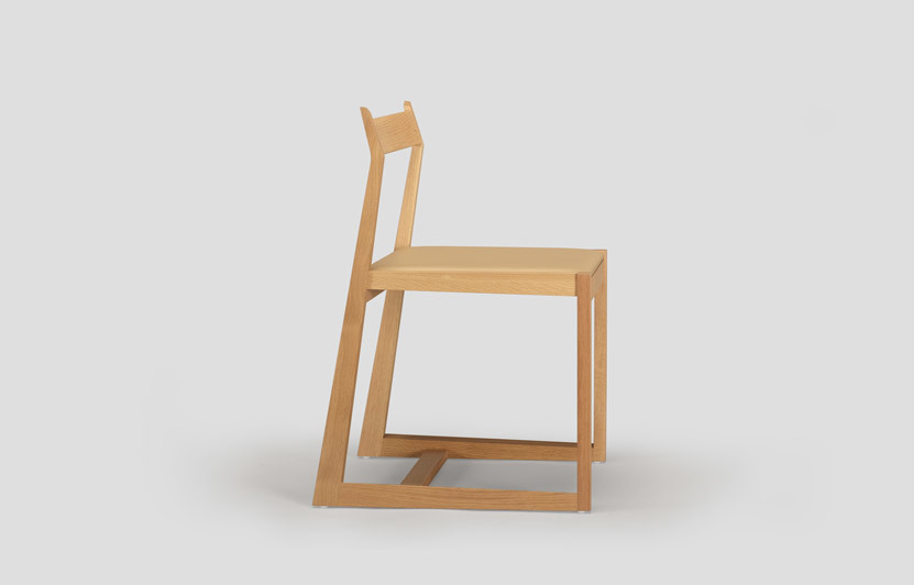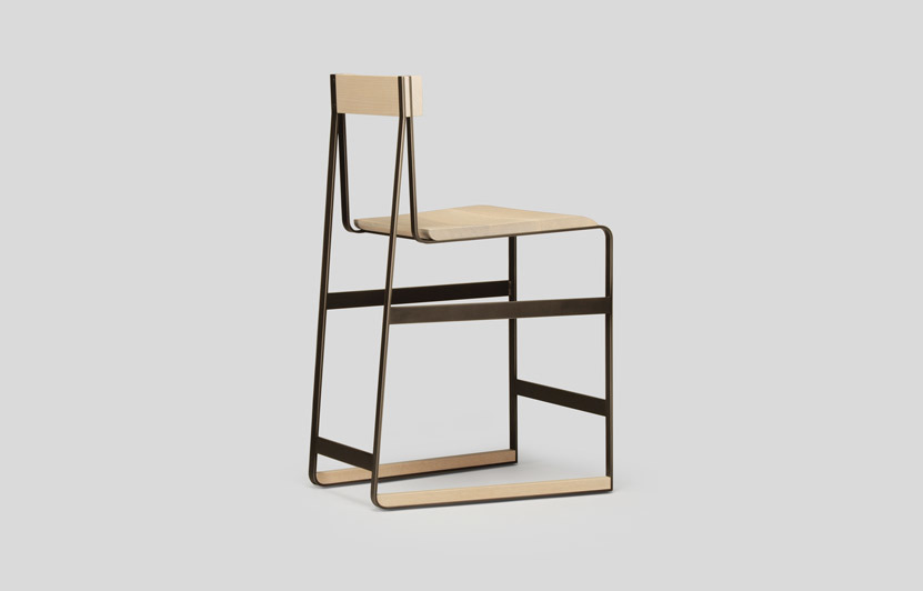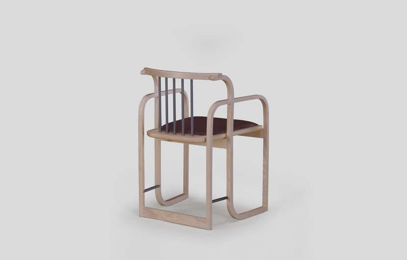 Steam-bent natural white ash timber frame with mortise-and-tenon, pinned half-lap, and triple spline joinery. Low profile, high density upholstered drop-in seat in mammut_dark red leather. Steel back splats and stretchers with matte blasted steel finish.