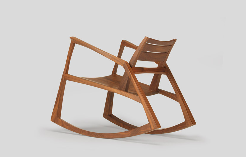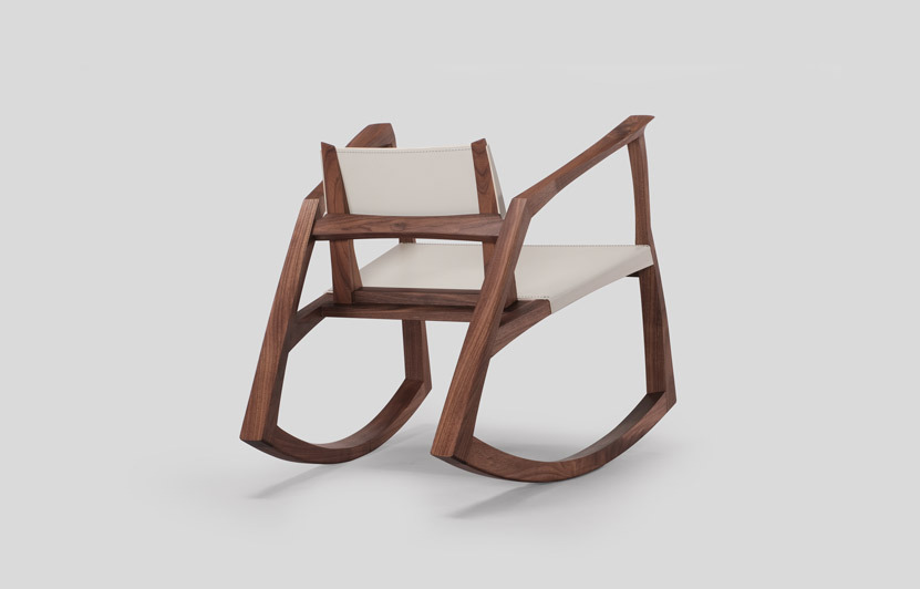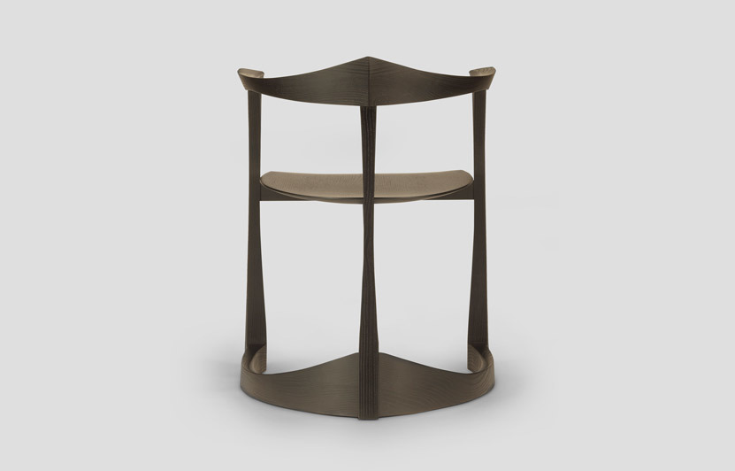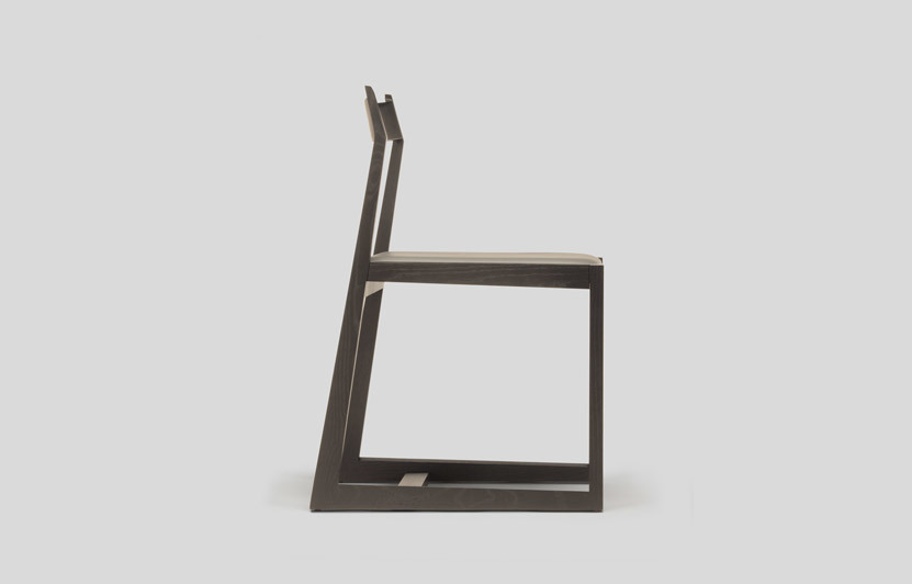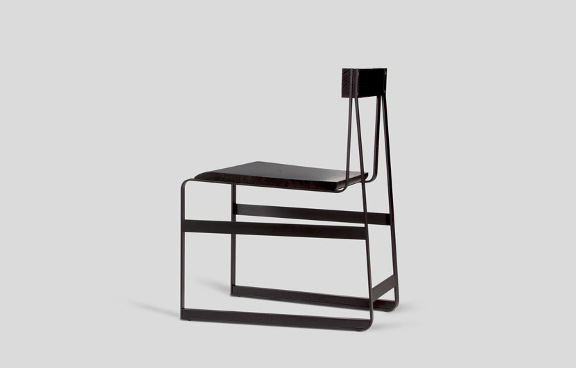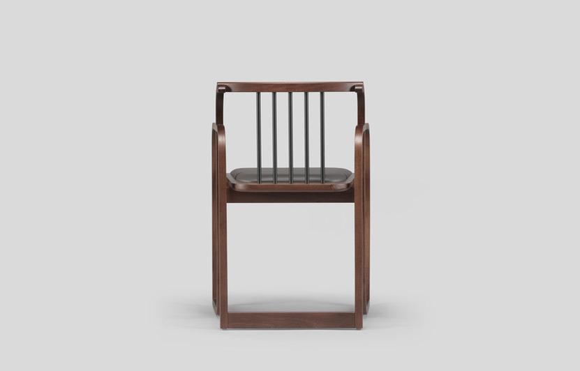 Steam-bent walnut timber frame with mortise-and-tenon, pinned half-lap, and triple spline joinery. Low profile, high density upholstered drop-in seat in mammut_grey leather. Steel back splats and stretcher elements with matte opaque black finish.