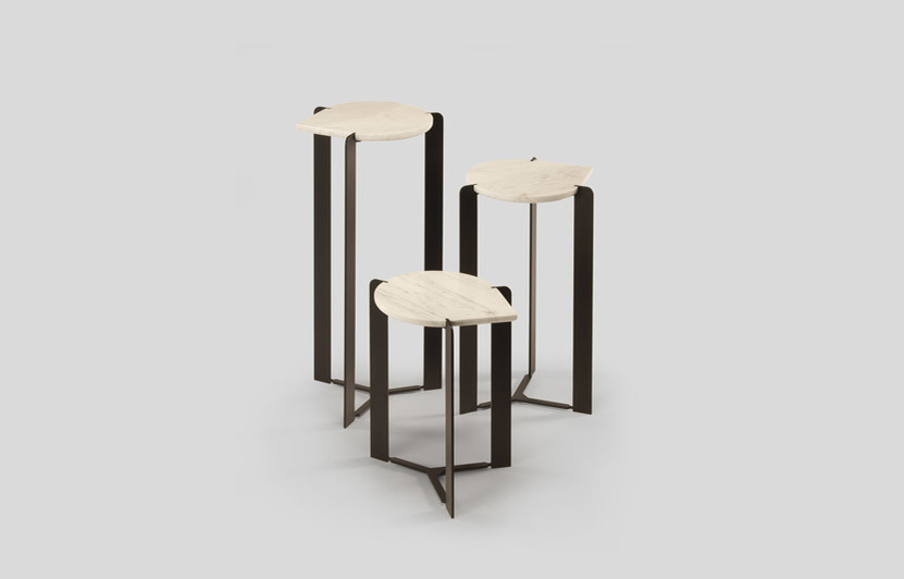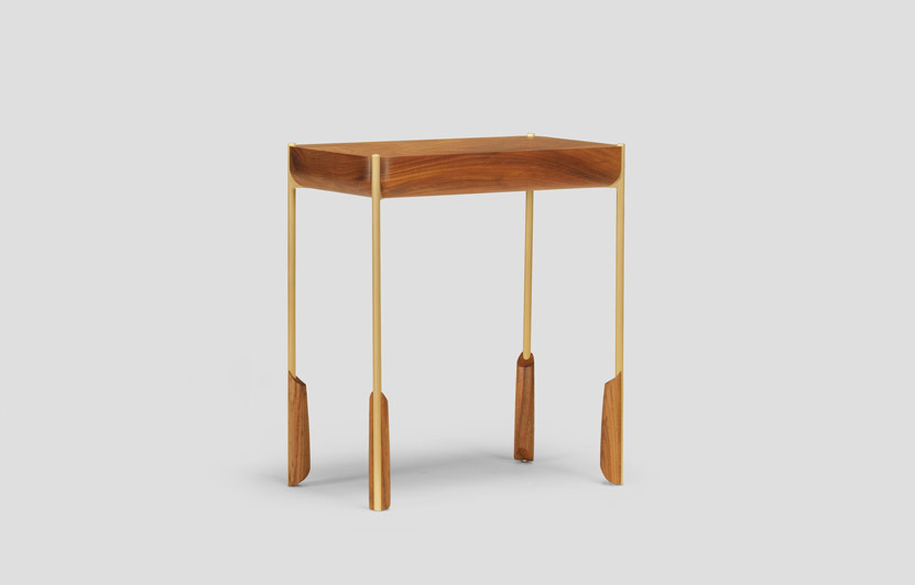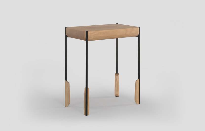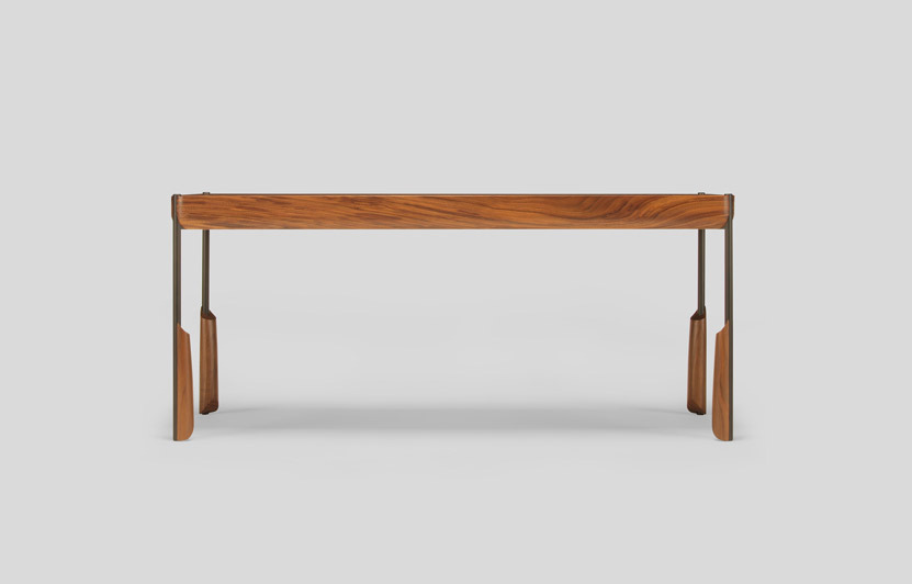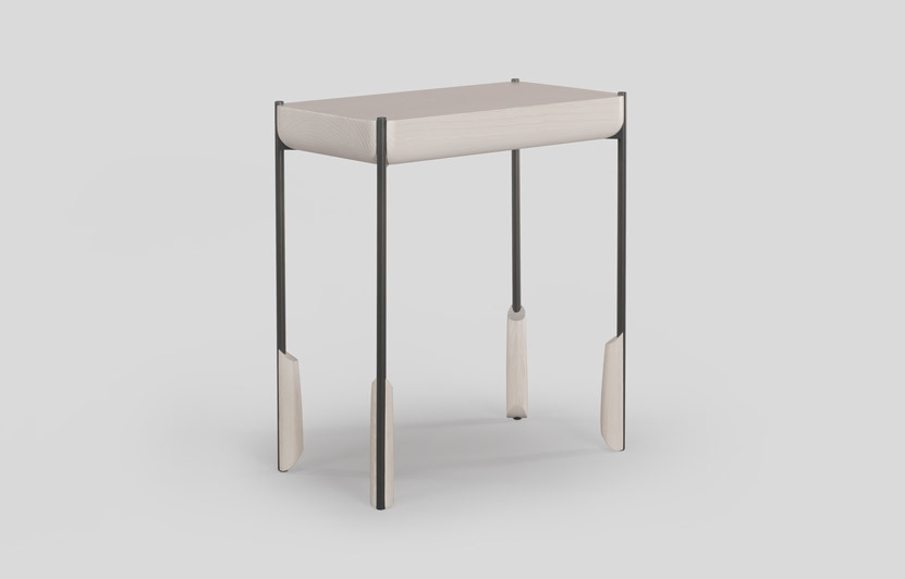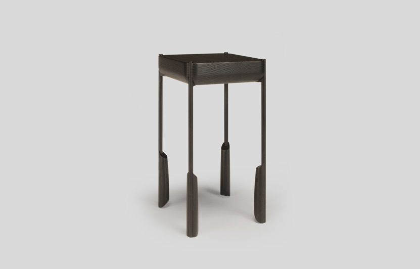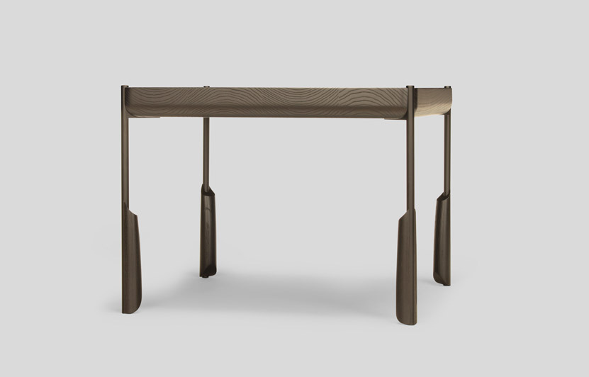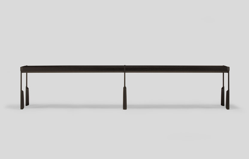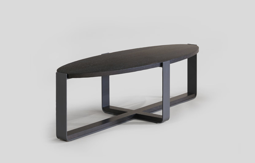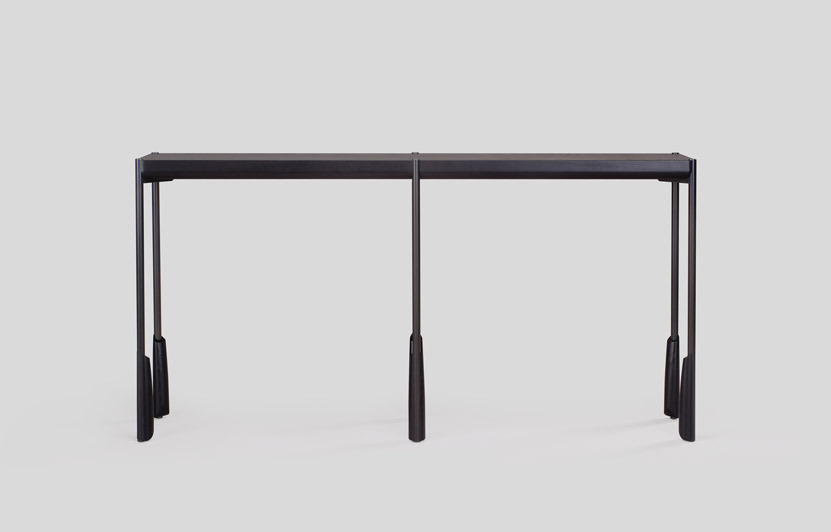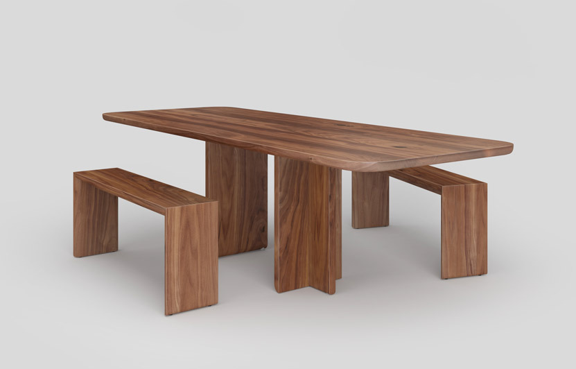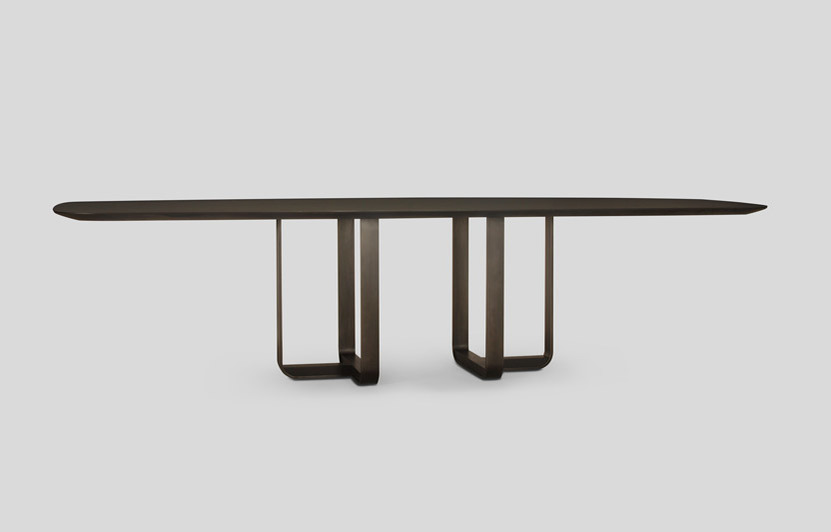 Solid 2.5” thick timber top with reverse bullnose edge profile and Altai leg design. As shown here in ebonized white ash and matte opaque black metalwork. Contact skram for additional details.
