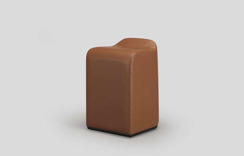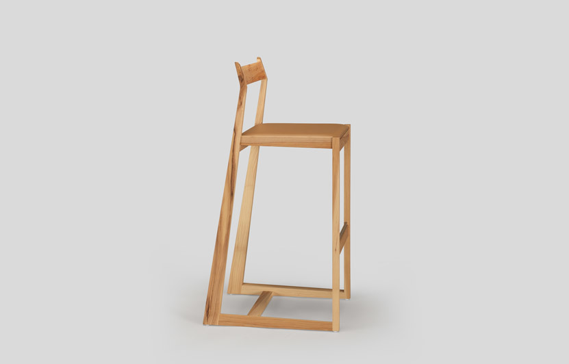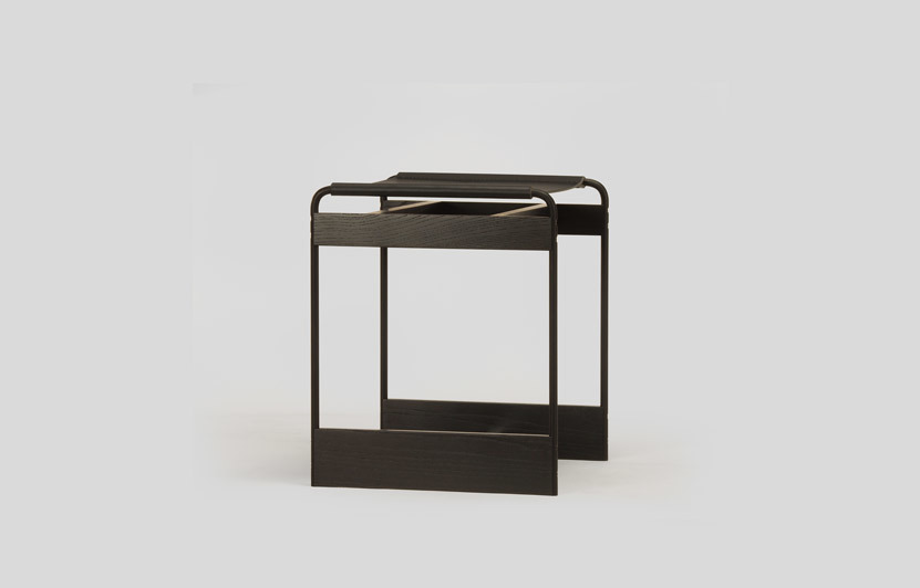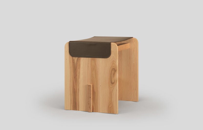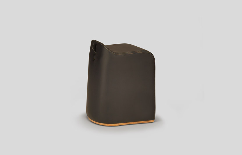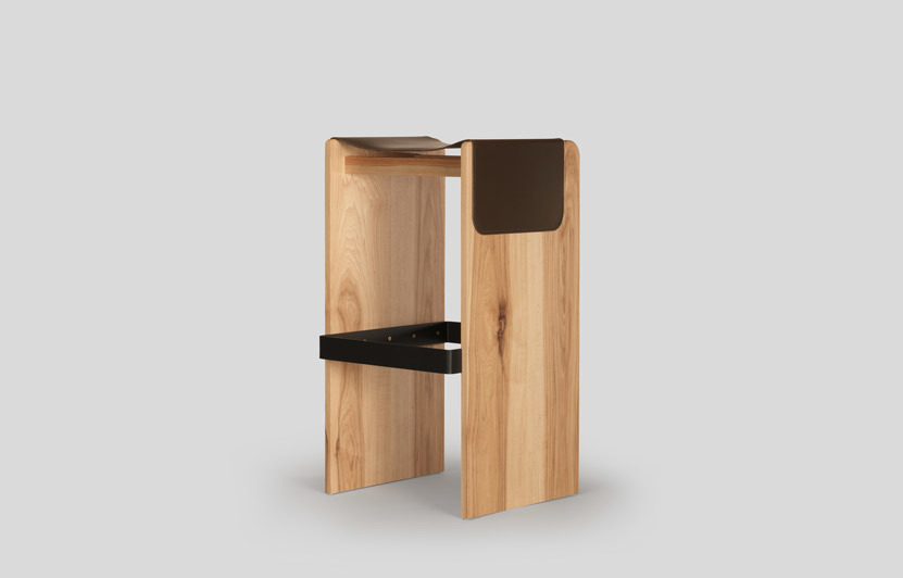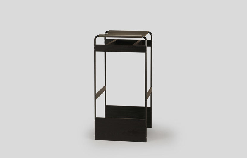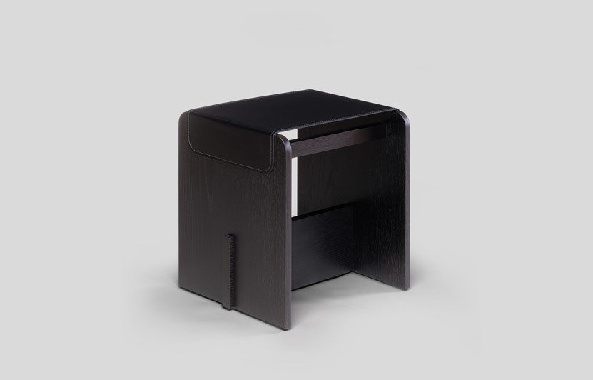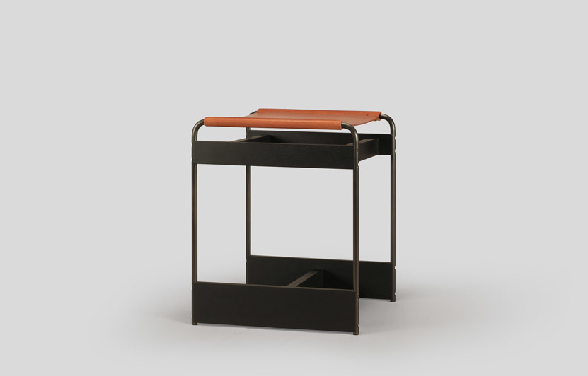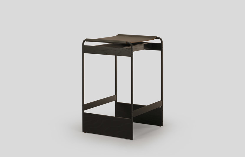 Non-standard height. Solid timber internal frame upholstered in mammut_saddle leather. Double-needle stitching detail in black thread. Solid rift white oak, ebonized timber exposed base plate. Black leather loop pull.