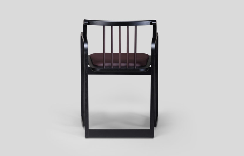 Steam-bent ebonized white ash timber frame with mortise-and-tenon, pinned half-lap, and triple spline joinery. Low profile, high density upholstered drop-in seat in mammut_burgandy leather. Steel back splats and stretchers with gunmetal steel finish.
