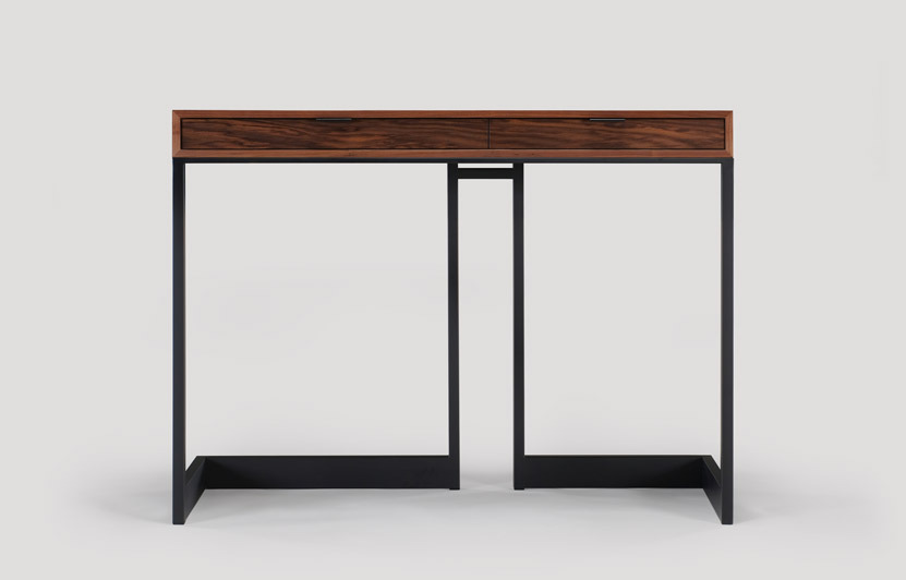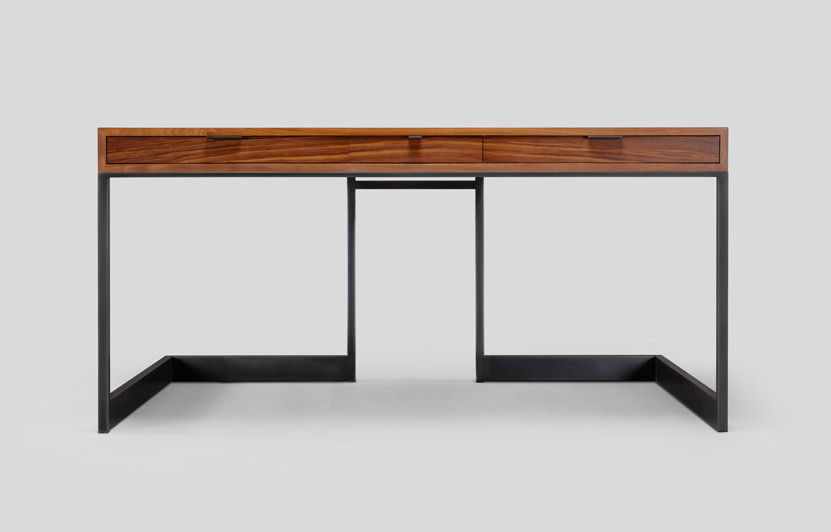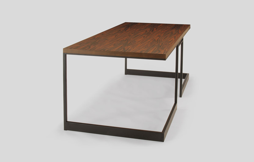 Hand-bookmatched veneer longwoods (all standard options) with solid timber banding/inlay on all edges and corners for added protection. Commercial-grade, low sheen natural wood finish. Green guard certified. As shown here in santos rosewood veneer with matte opaque black metalwork. Contact skram for more details.