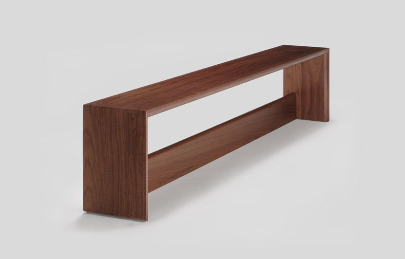 Solid walnut timber contruction with mortise-and-tenon joinery, and mitered corners with matched seams/waterfall edges. Stretcher beneath seat. Commercial-grade, low sheen natural wood finish. Green guard certified.