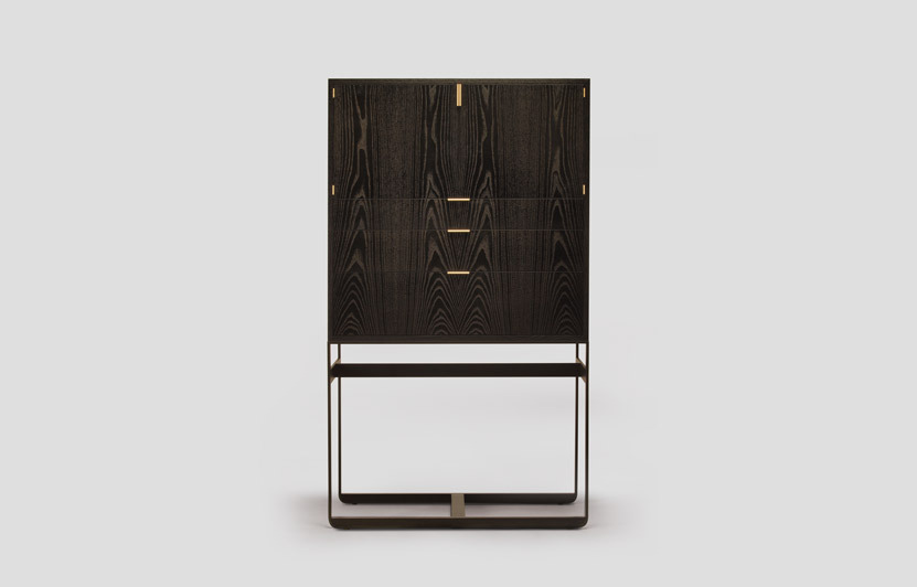 Hand-bookmatched ebonized white ash veneer with timber inlayed detailing on edges and corners. 3 drawers/2 doors in hand-matched longwoods. Matte opaque black steel metalwork with low profile tab pulls in natural rubbed bronze.