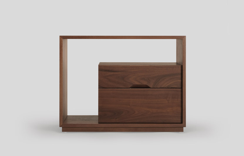 Solid Walnut timber construction with mitered corners and matched seams/waterfall edges. Solid maple drawers with cork-lined bottoms riding on soft-closing concealed runners with recessed, integral pulls. Commercial-grade, low sheen natural wood finish. Square edge profile.