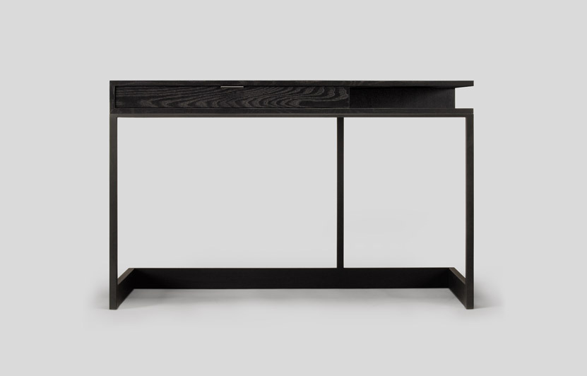 Solid 2.5” thick timber top with reverse bullnose edge profile and Altai leg design. As shown here in ebonized white ash and matte opaque black metalwork. Contact skram for more details.
