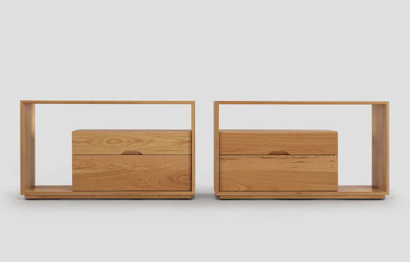 Non-standard material. Solid Hickory timber construction with mitered corners and matched seams/waterfall edges. Solid maple drawers with cork-lined bottoms riding on soft-closing concealed runners with recessed, integral pulls. Commercial-grade, low sheen natural wood finish. Available as a pair only. Pricing shown for the pair.